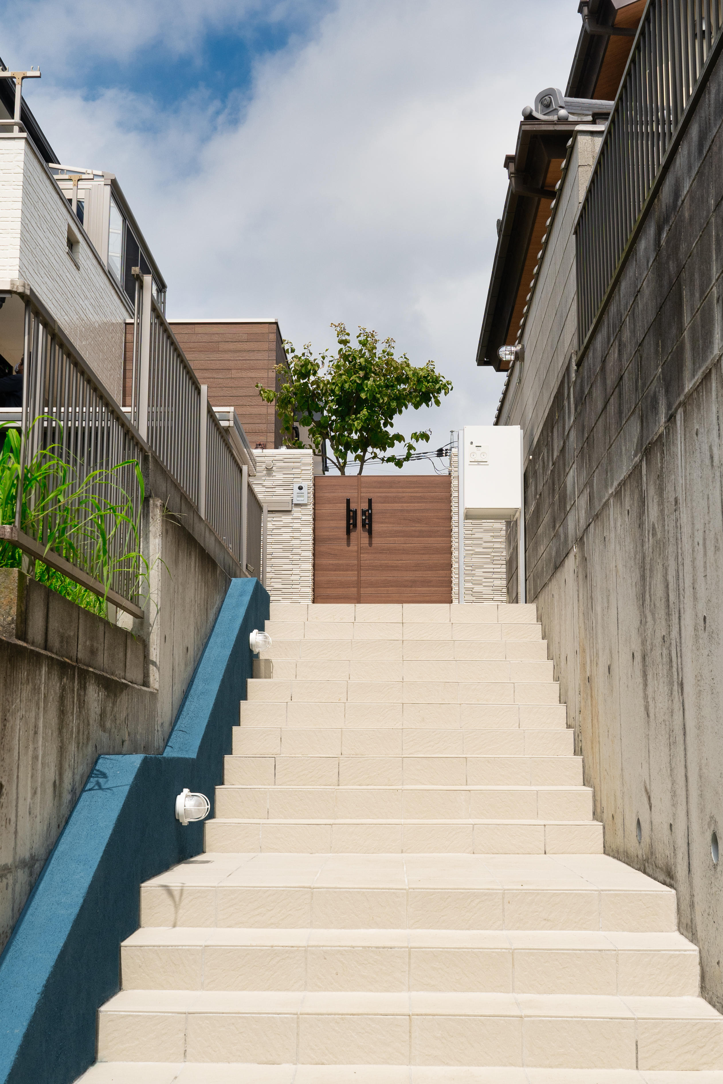 階段脇の青い壁にマリンランプ。門に続く白い階段と宅配ボックスが爽やかです。