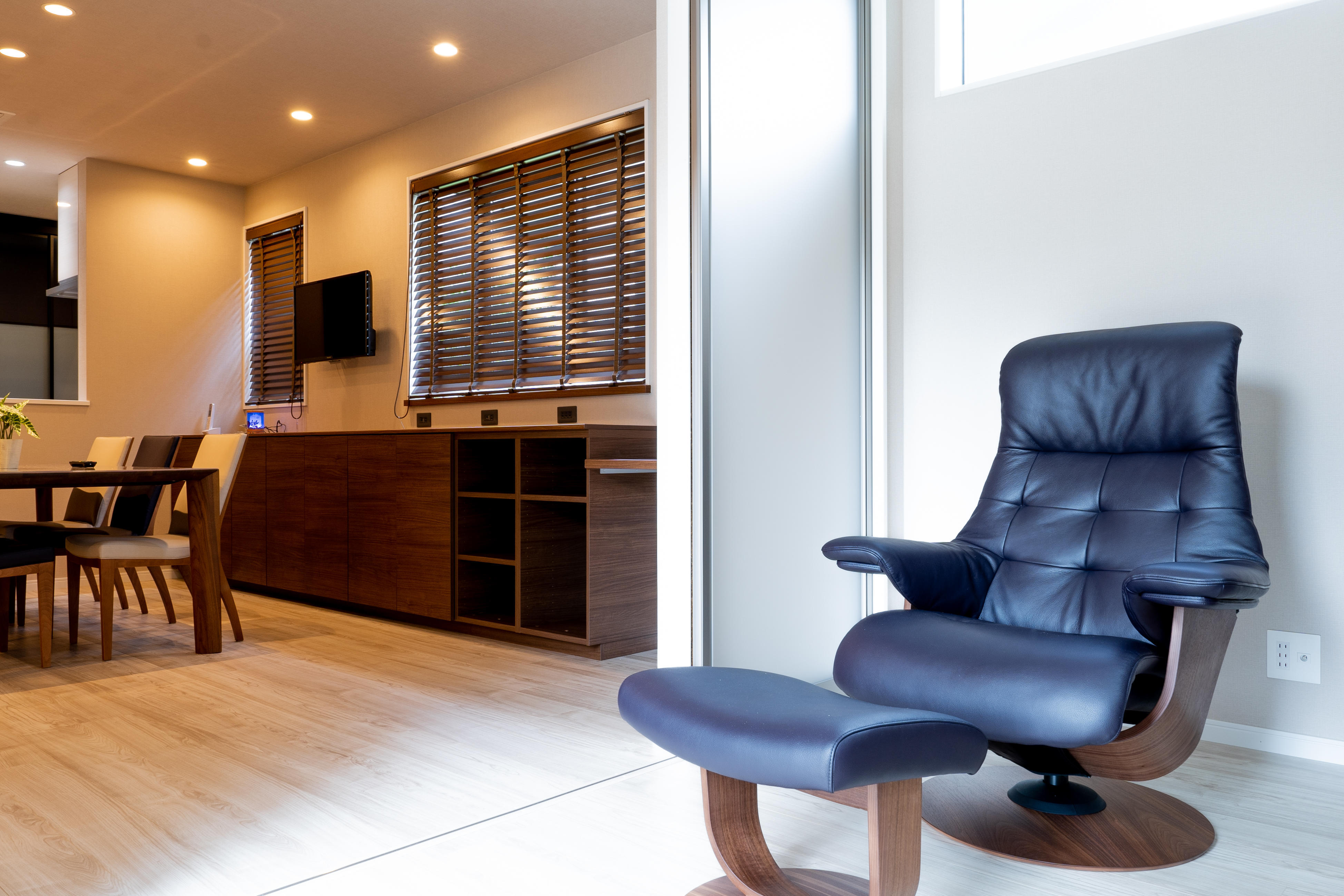 ダイニングの横に書斎。ウッドデッキに出られるこの部屋で在宅ワークも快適です。