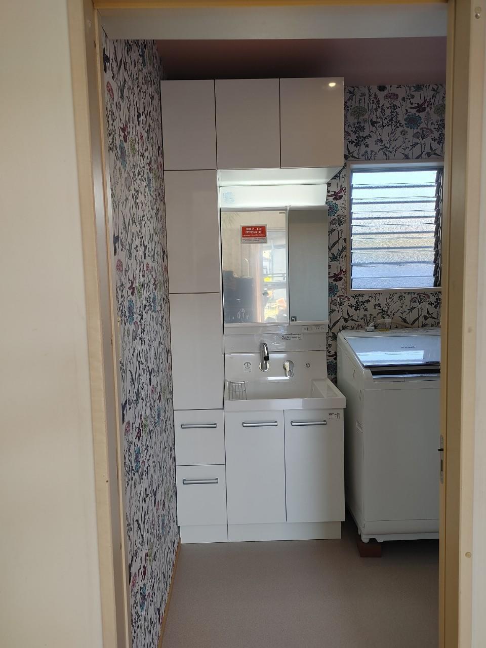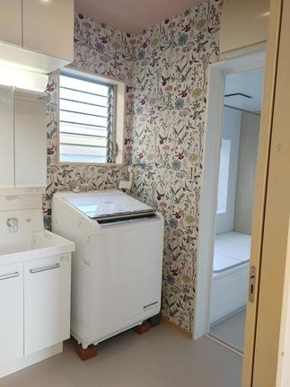 ユニットバス、洗面化粧台、壁紙を交換しました。 壁紙は「鳥と花」冒険してみました。 チャレンジ大成功! お施主様にも大変気に入って頂きました。