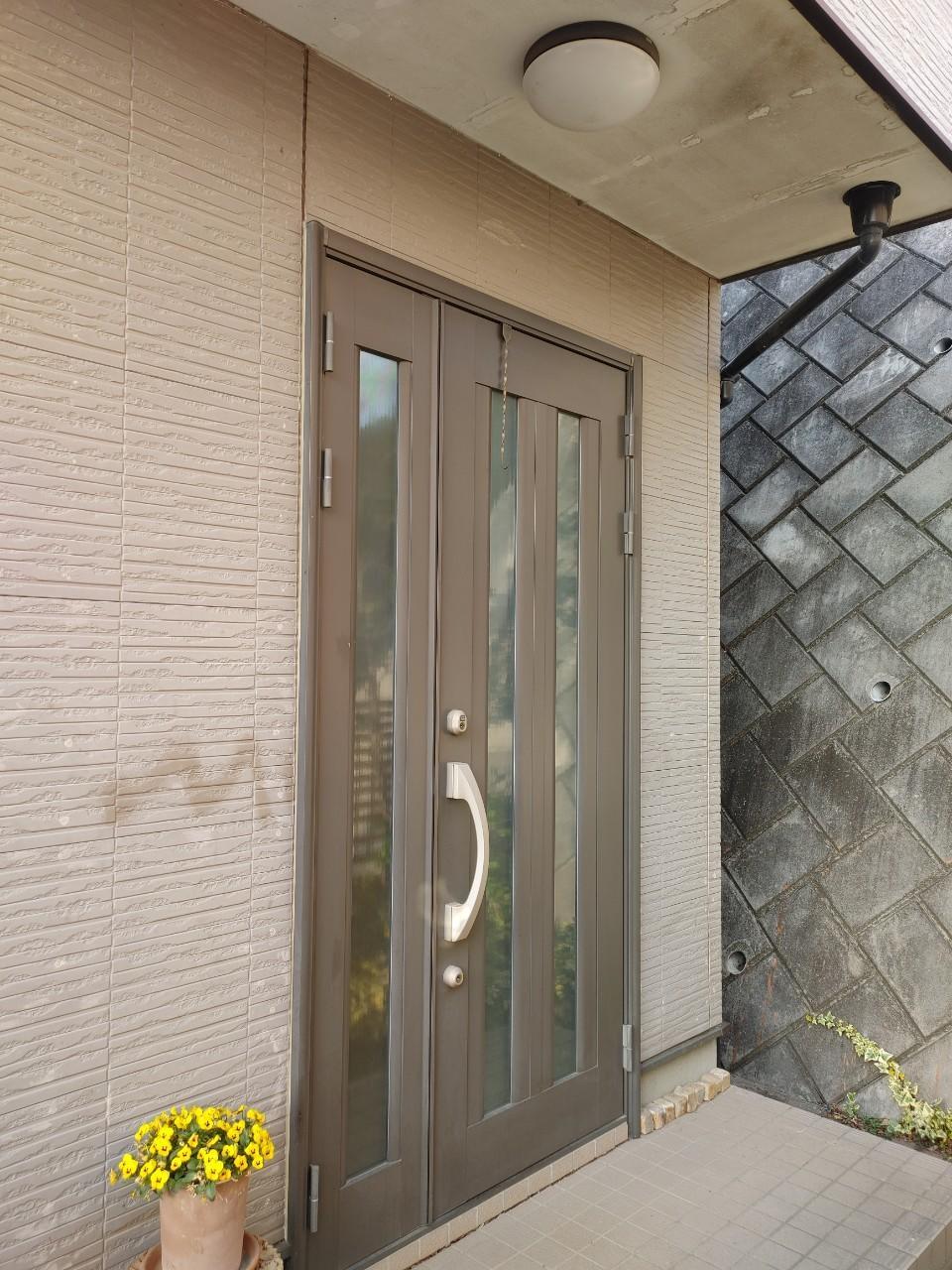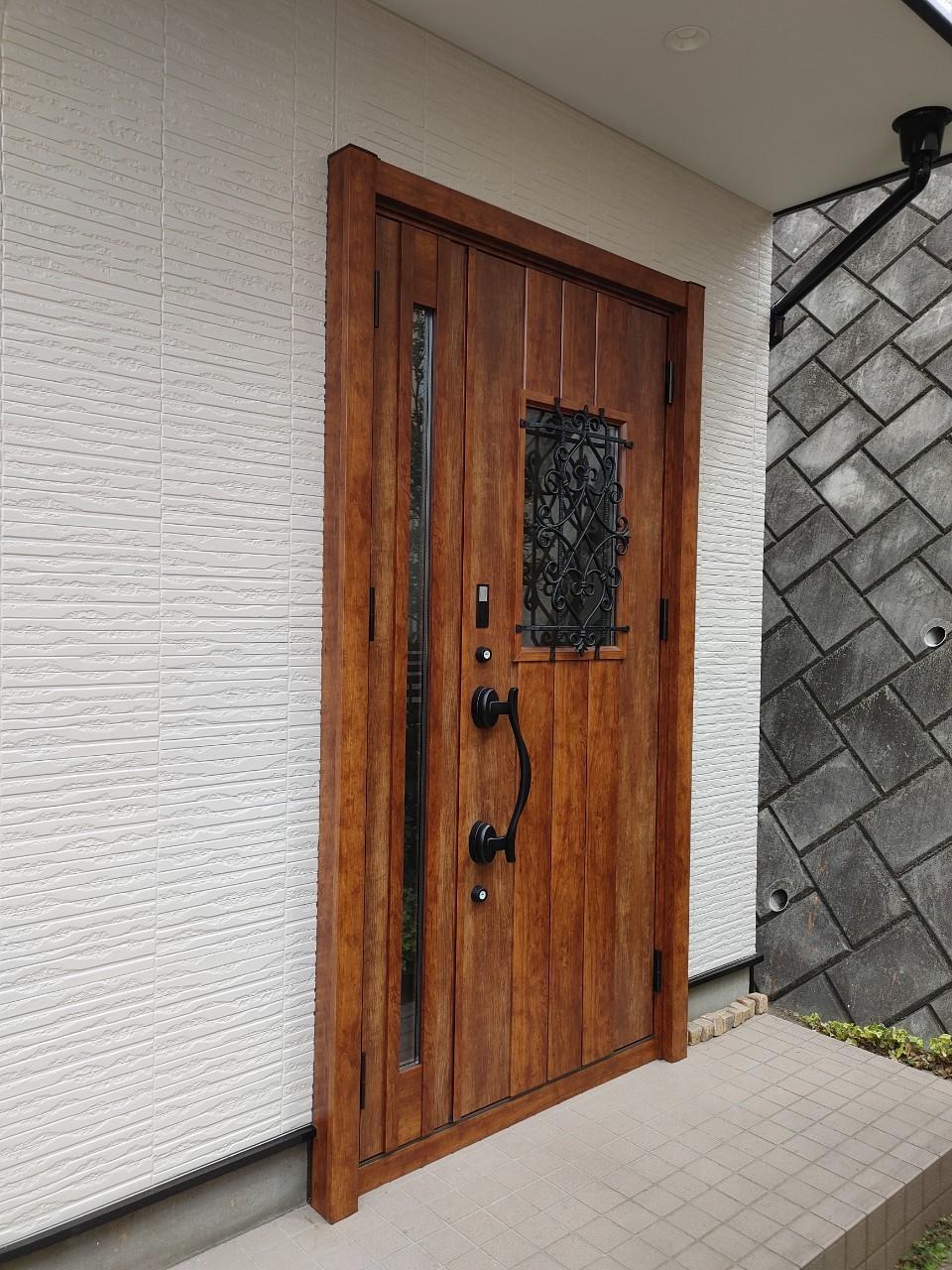 玄関ドアリシェントに交換、断熱性能アップと色合いを木目にして落ち着いた雰囲気になりました。