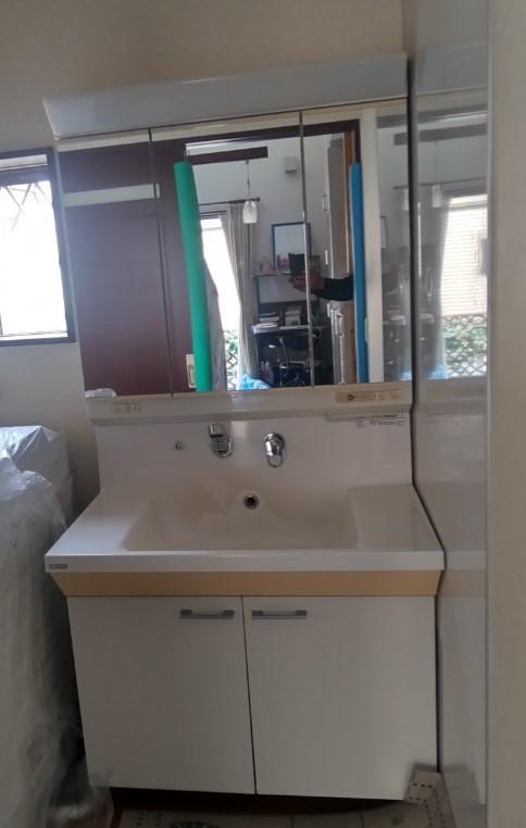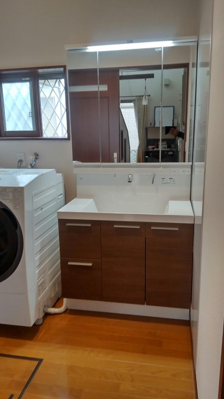 洗面化粧台の交換をしました。 タッチレス水栓「ナビッシュ」は、泡だらけの手で触らないので水栓が汚れず、いつもきれいです♪ 水の出しっぱなしもふせぎ、節水にも効果的です。 もちろん、従来の水栓のように手動吐水にもなります。