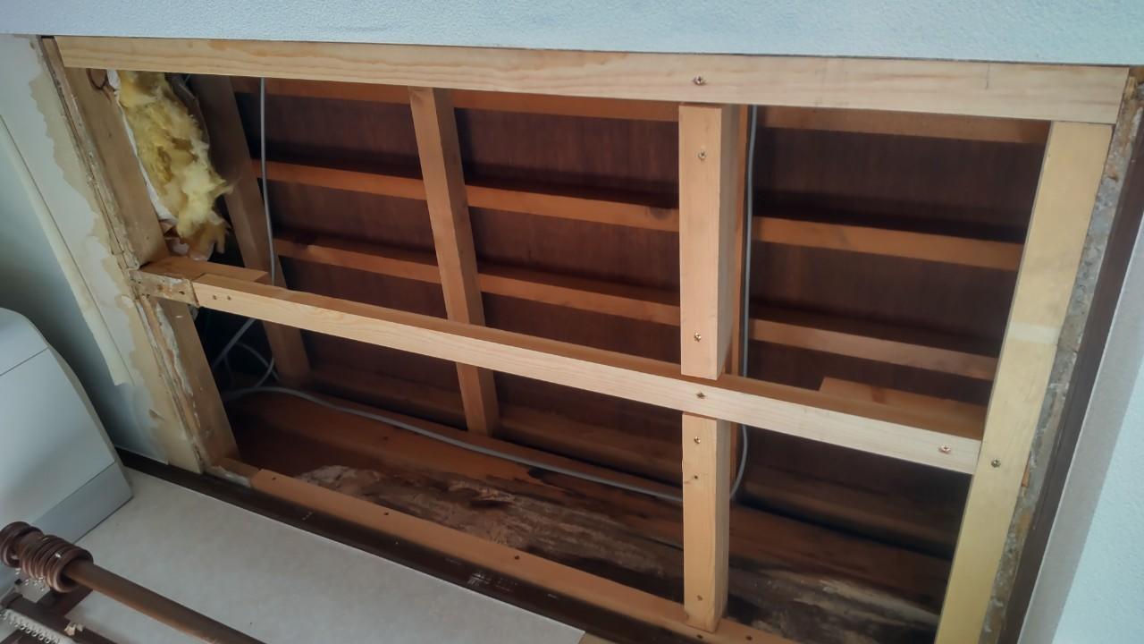 セメント瓦が割れていたため、2階の部屋で雨漏り発生! 普段使用していない部屋なので気づくのが遅れ、雨水を含んだ断熱材の重みで天井が下がってしまいました。 瓦の補修をし、「雨漏りがしないのを確認」してから断熱材の入れ替え、天井ボードや天井板の交換をしました。