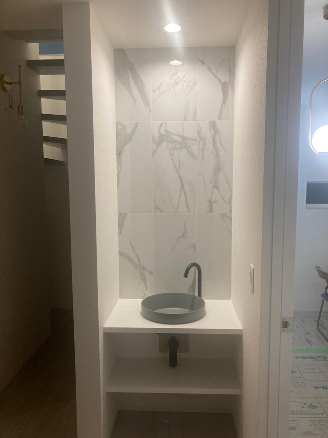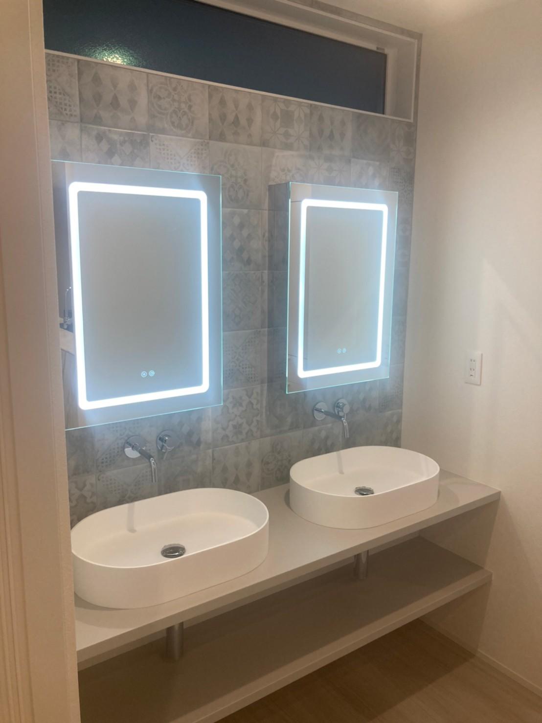 外観も室内も落ち着いたモノトーンのカラーリングでスッキリと洗練された印象に仕上がりました。 朝の忙しい身支度時間でおきる『洗面化粧台の争奪戦』を回避するため、ツーボールの洗面台を設置! 見た目はシンプルですが、考え抜いたこだわり満載のお家が完成しました♪
