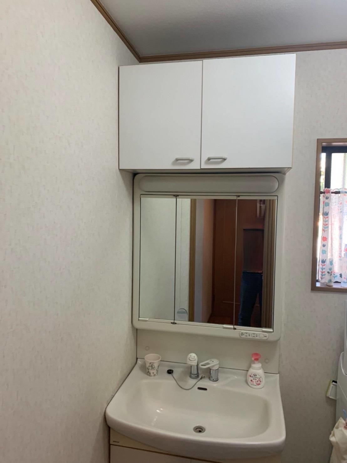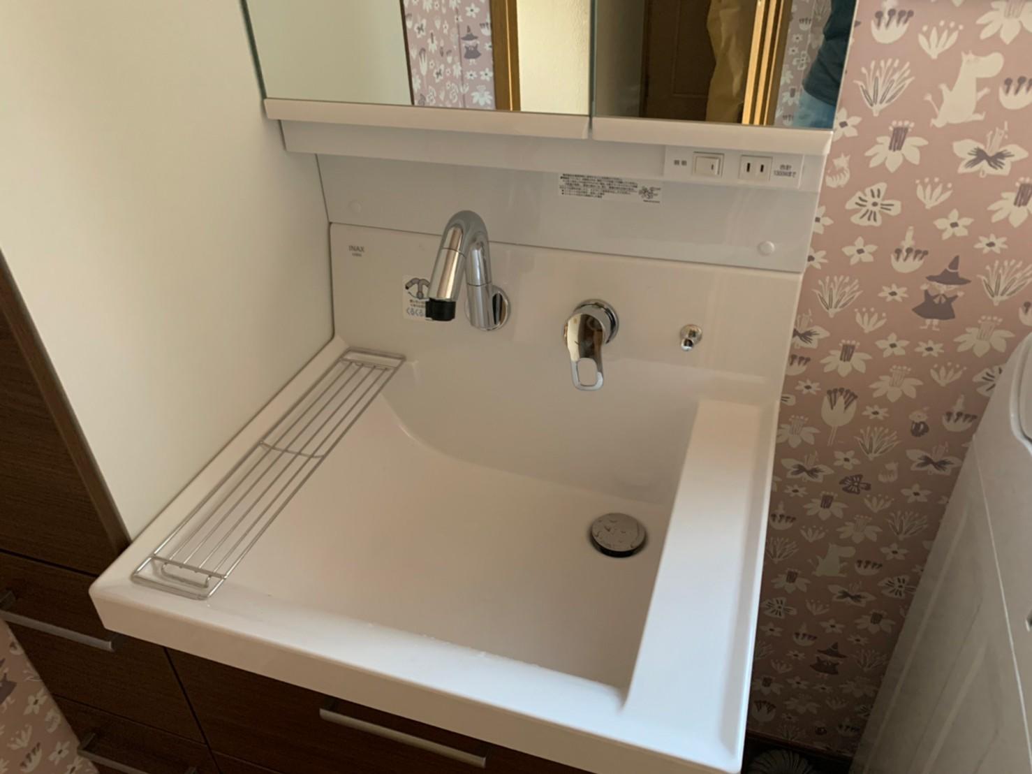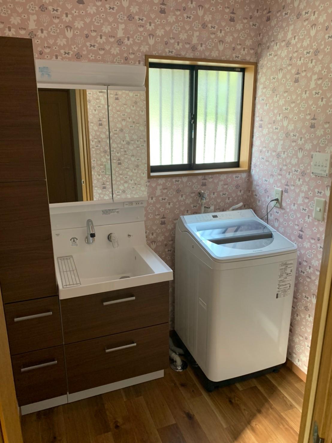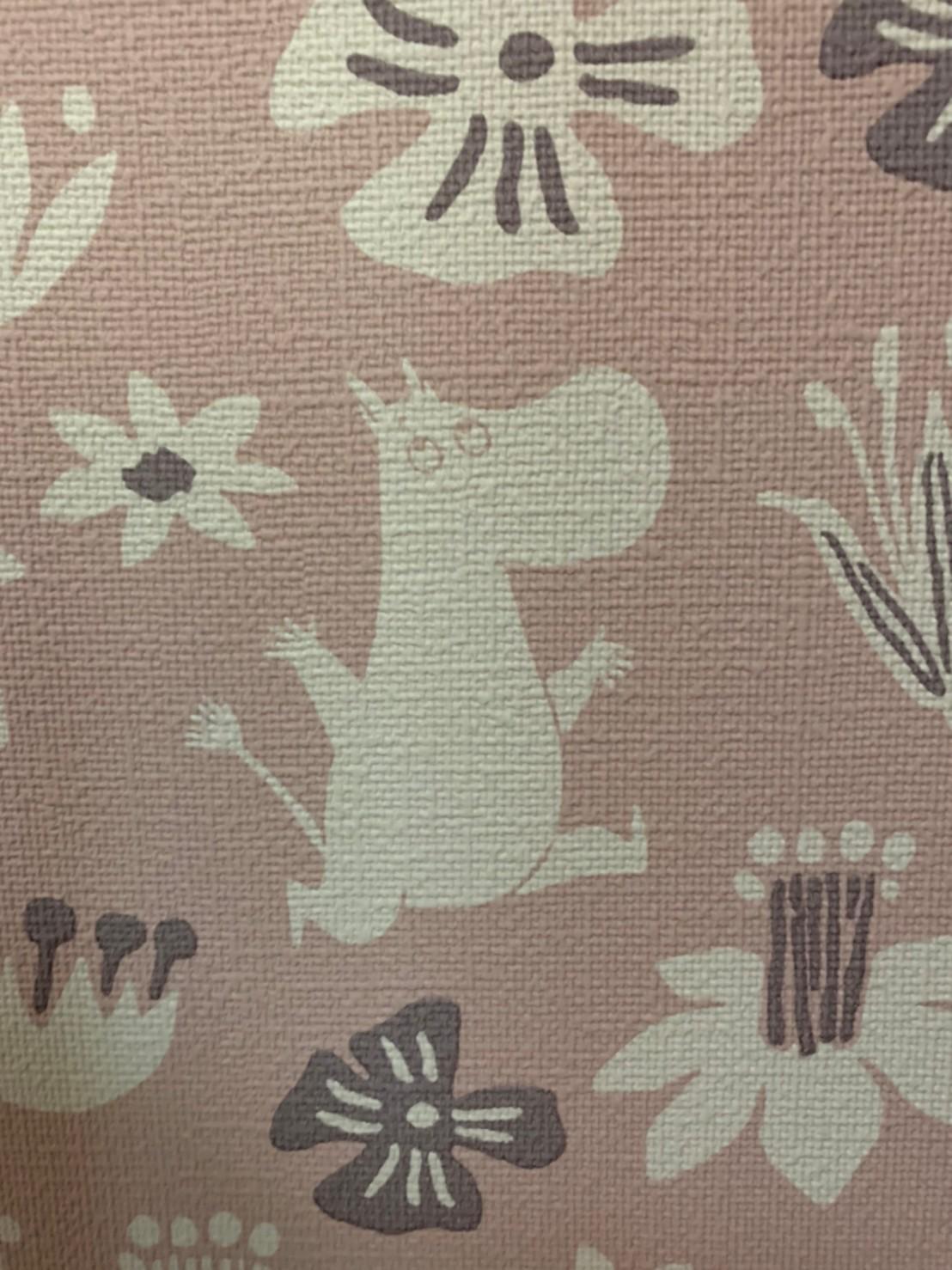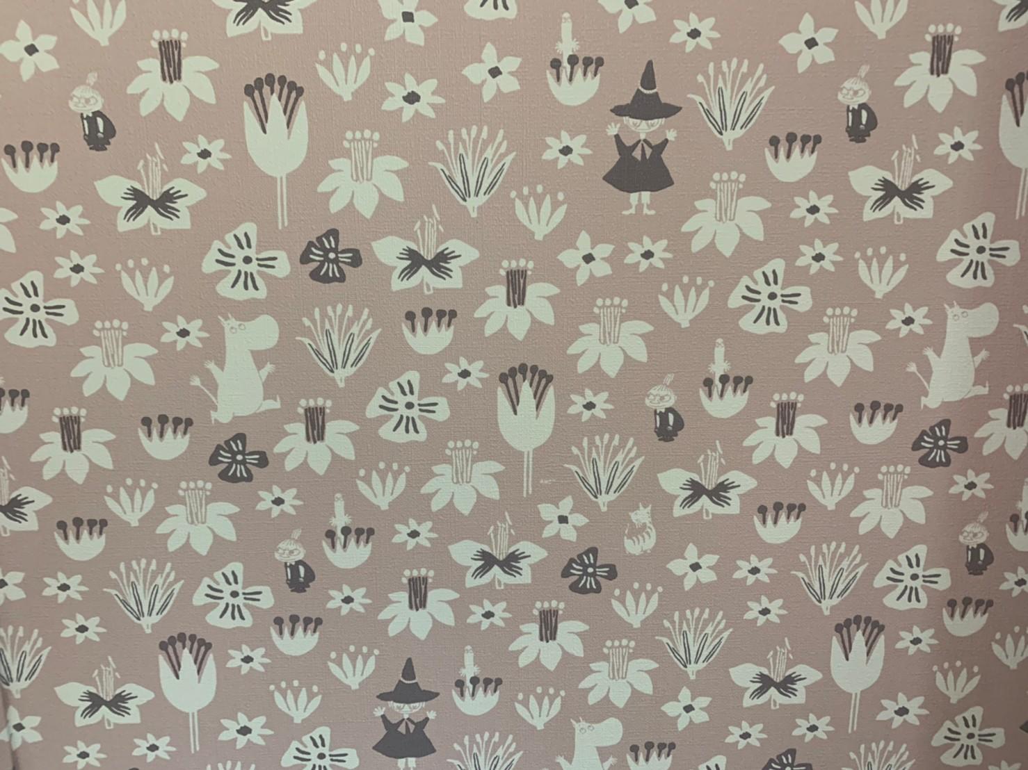壁紙のムーミンが可愛いのにシックで、落ち着いた感じの洗面所になりました。