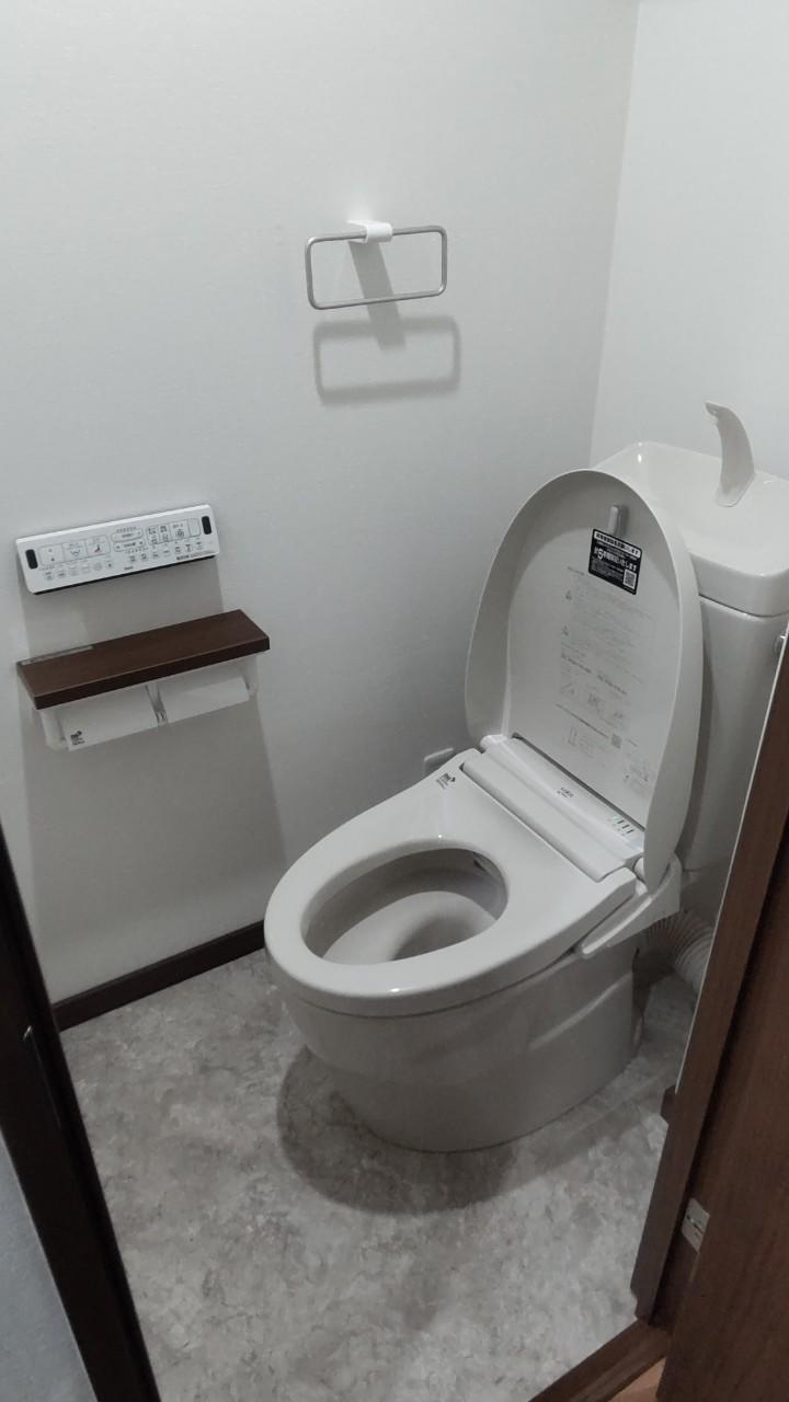 上品かつ、シンプルなデザインの棚付紙巻器とタオルリングでスッキリとした「ハンサムトイレ」に大変身です!