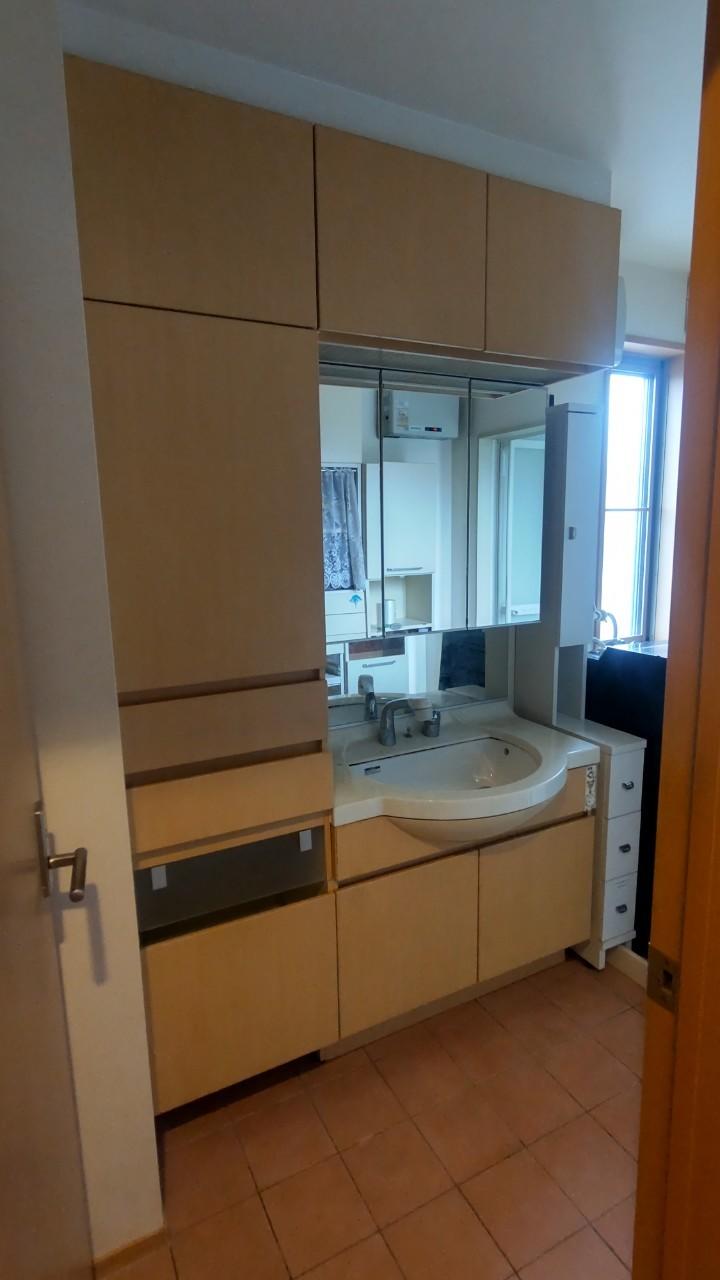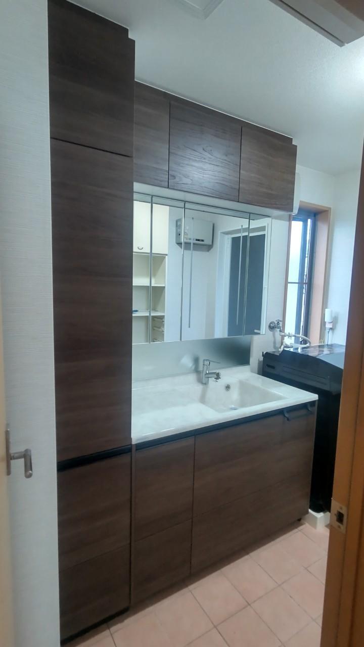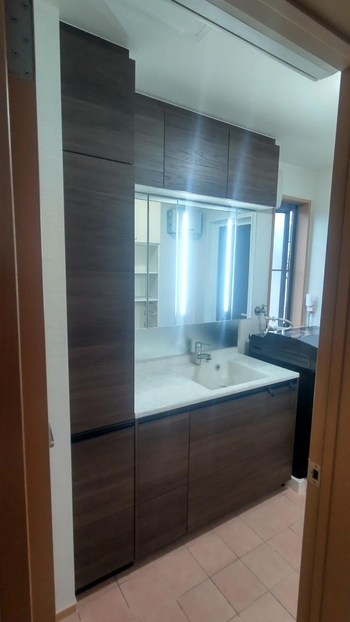 洗面化粧台交換をしました。 2本のLEDが内蔵された鏡面は凹凸がなく見た目もスタイリッシュで、お手入れも簡単。 アクリストーンクオーツカウンターとボールは、衝撃に強く、キズがつきにくいため、うっかり重い物を落としても安心です。