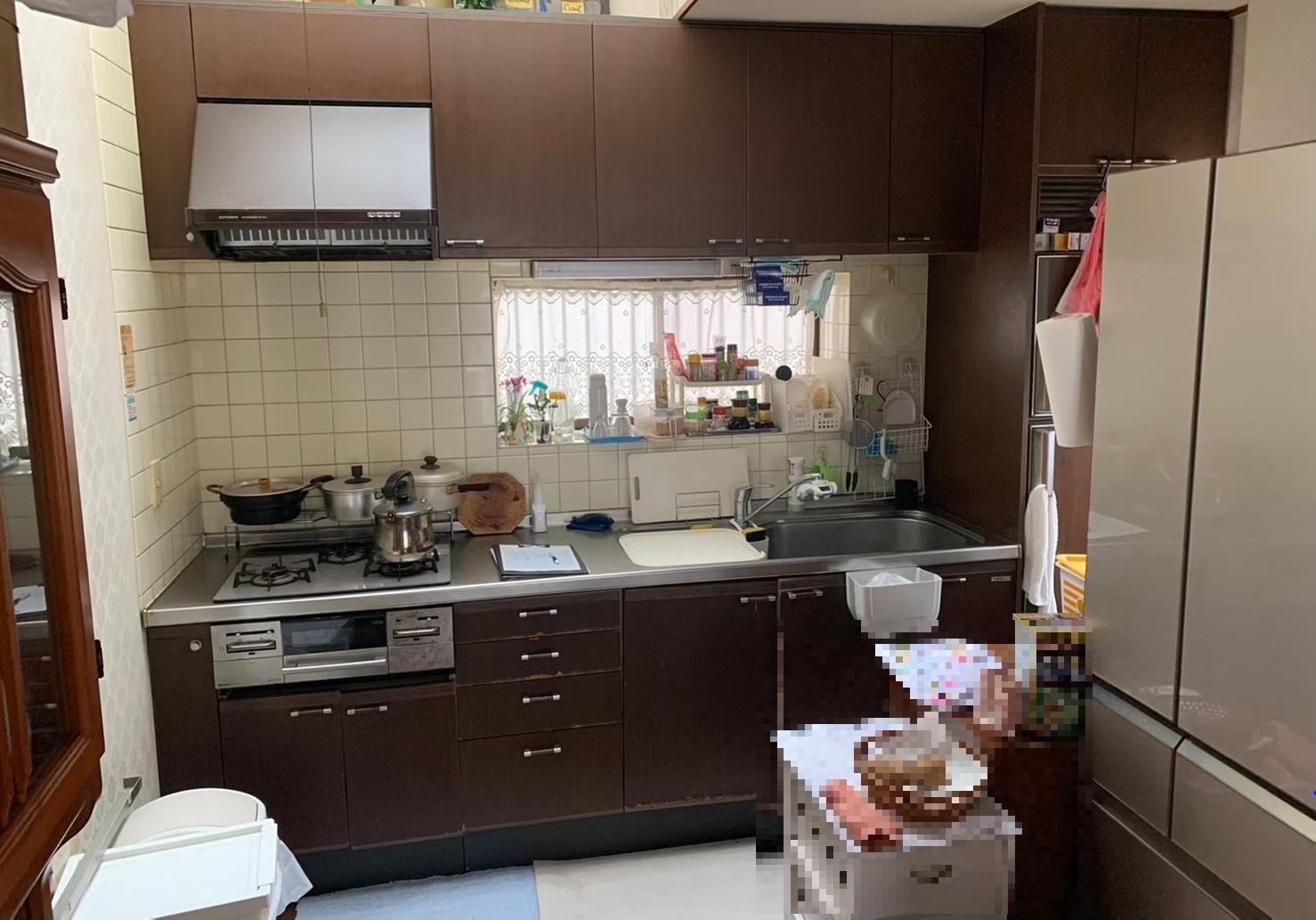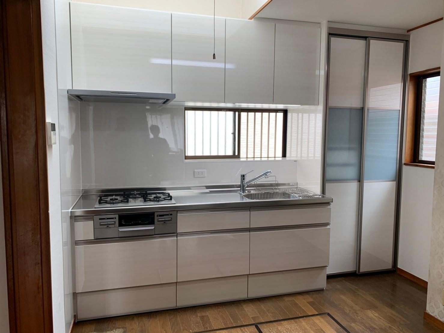 一昔前のシステムキッチン、冷蔵庫がビルトインタイプで、壊れてしまった後は大きな邪魔者となっていました・・・。 新しくキッチンを入れた後は冷蔵庫の位置にキッチンクローゼットを設置。 天井近くまでたっぷりしまえるので、収納力が大幅にUPしました♪ 色もホワイト系で、光降り注ぐ明るい素敵なキッチンになりました。
