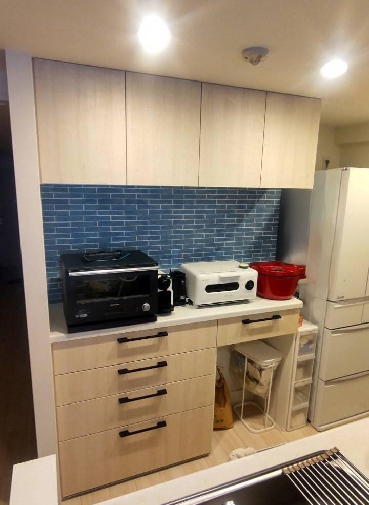 シンプルでスッキリとした白い壁も良かったのですが、収納が足りなく不便でした。 そこで、LIXILノクトシリーズの背面収納を設置しました。 アクセントクロスにスモーキーなブルーグレーのレンガをチョイス! キッチンの素敵なアクセントになりました♪