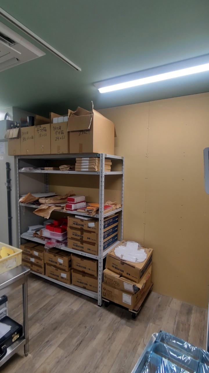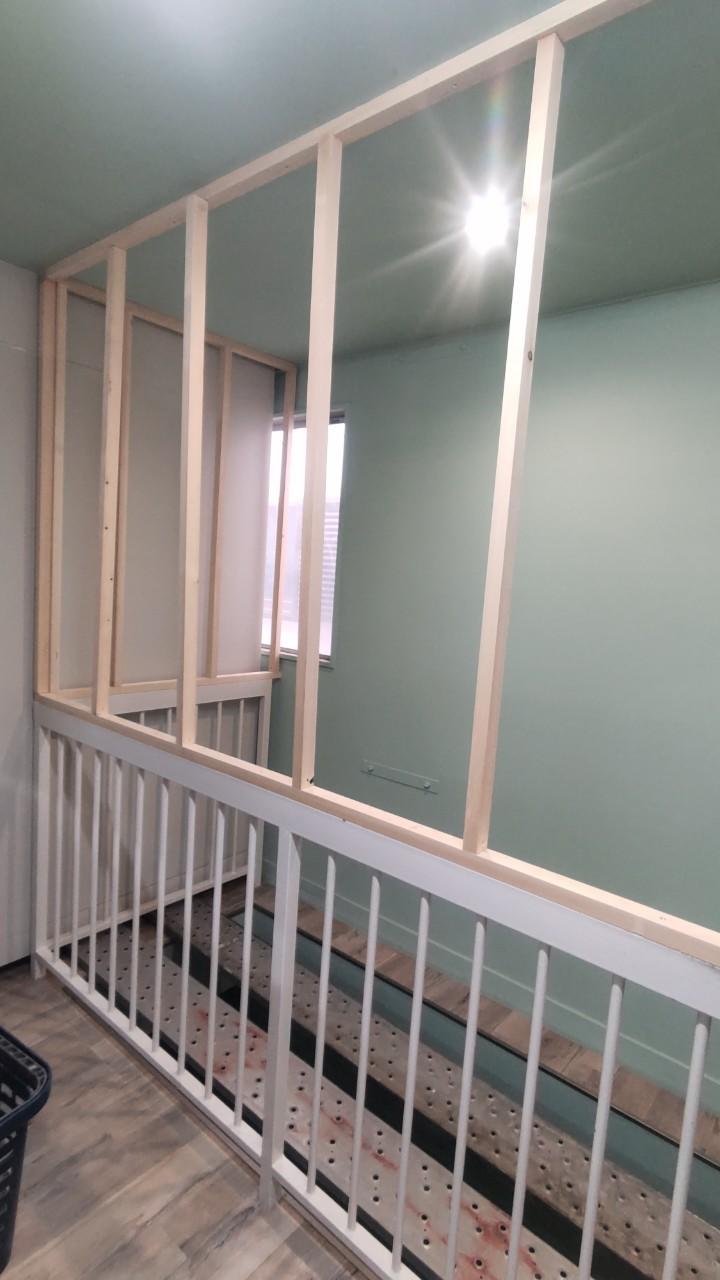 エアコン効率を上げるため、壁面造作工事をしました。 棚の後ろに壁ができたことで、高い位置に物を乗せても安心できますね。