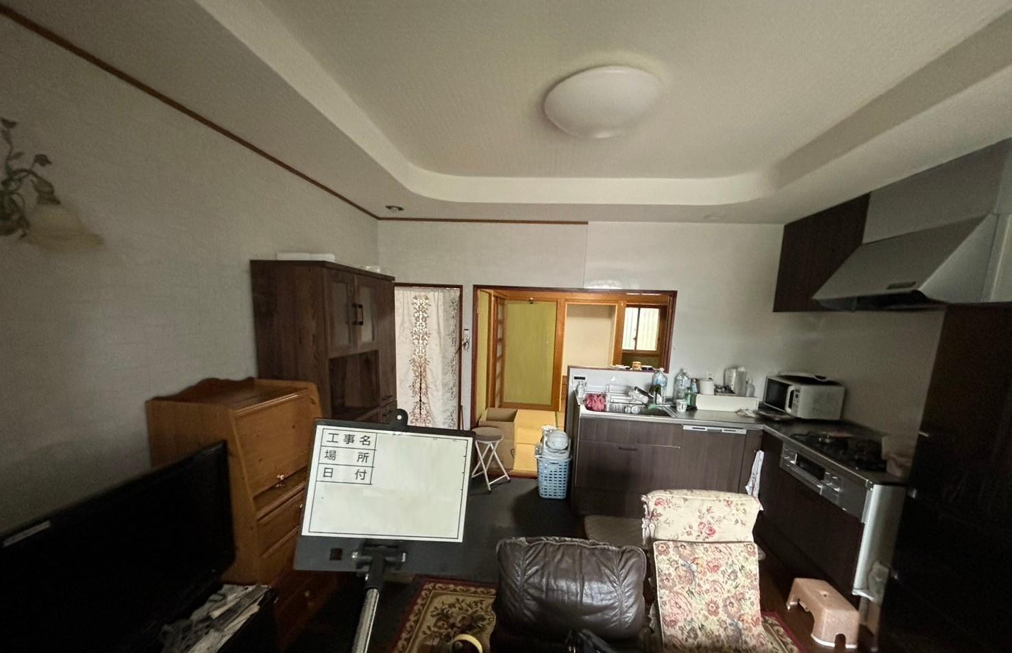 既存のキッチンはそのままに、LDKの改修を行いました。 一部飛び出ている壁には棚を付けて機能的に! 明るい色の壁紙と床材で、お部屋全体が見違えるようになりました♪
