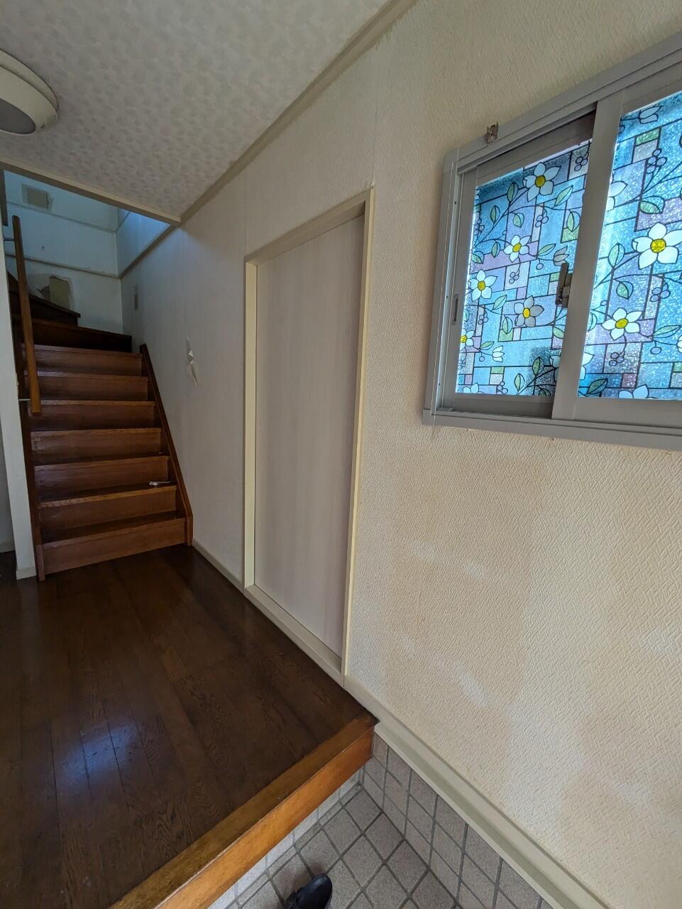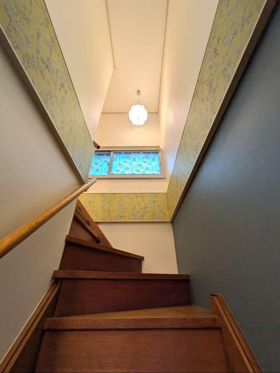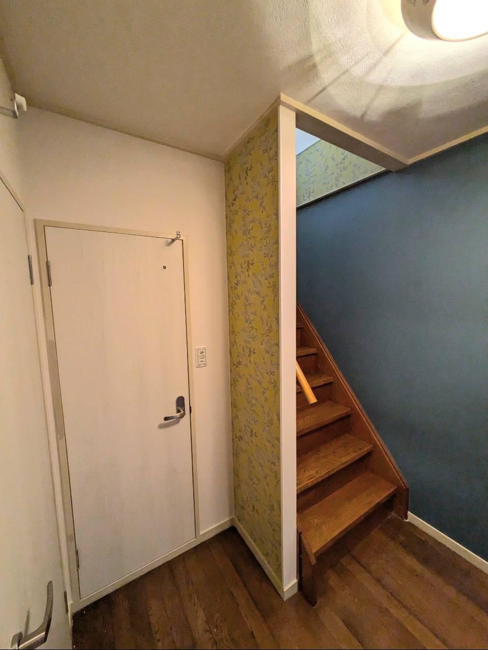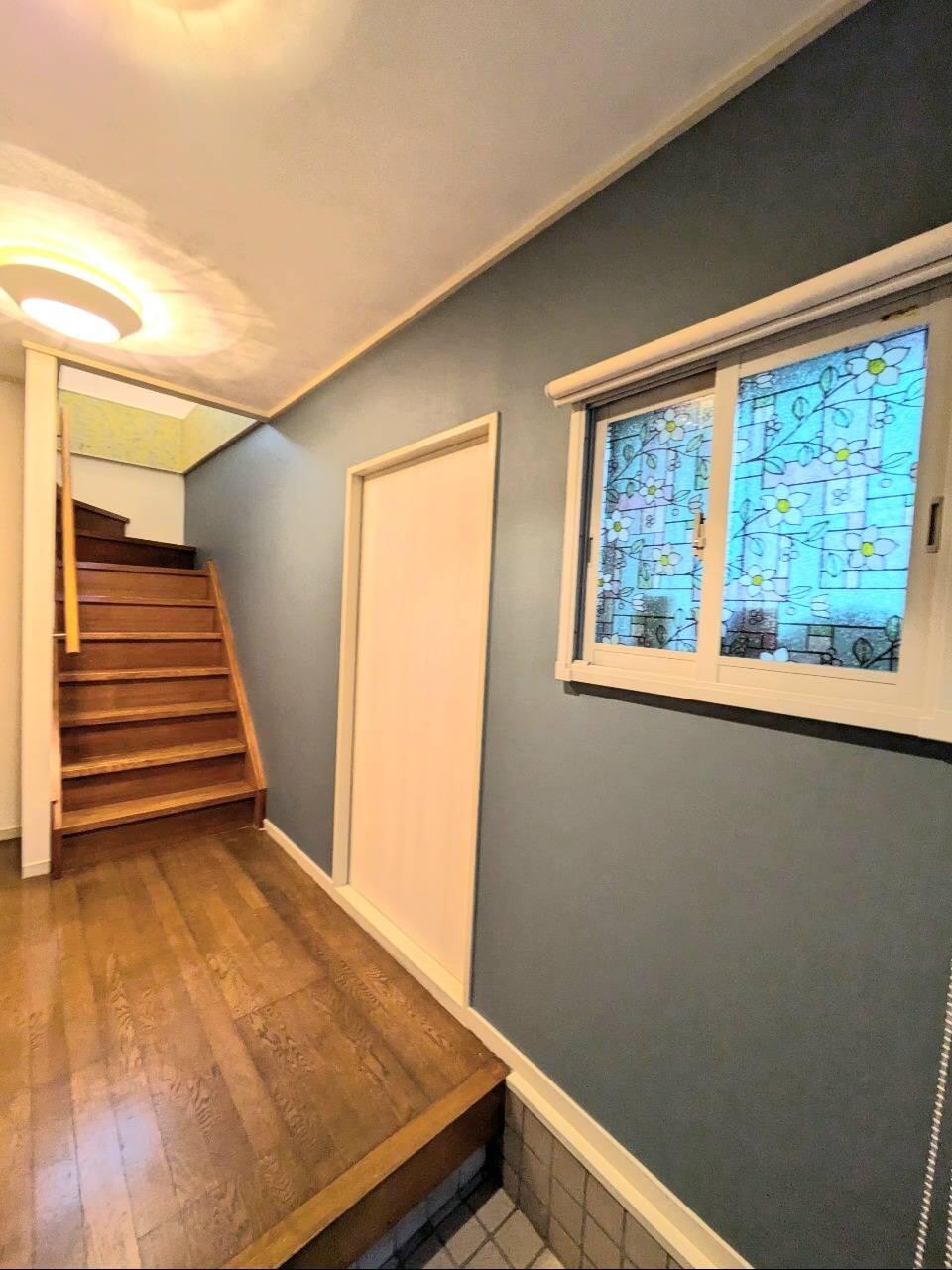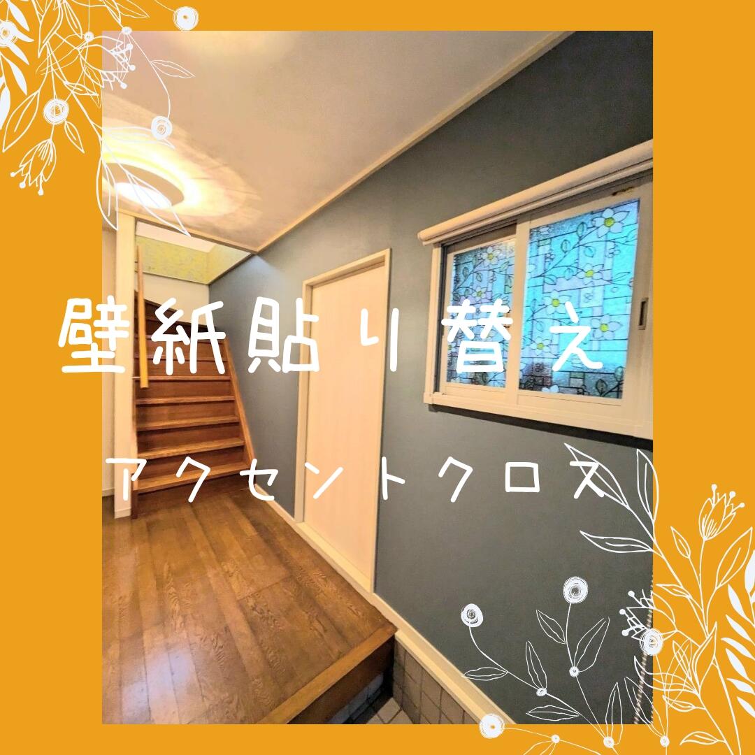 壁の一面だけ色を変える「アクセントクロス」を取り入れました。 色は人気のトレンド「ブルーグレー」です。 モダンで落ち着いた印象の玄関になりました。
