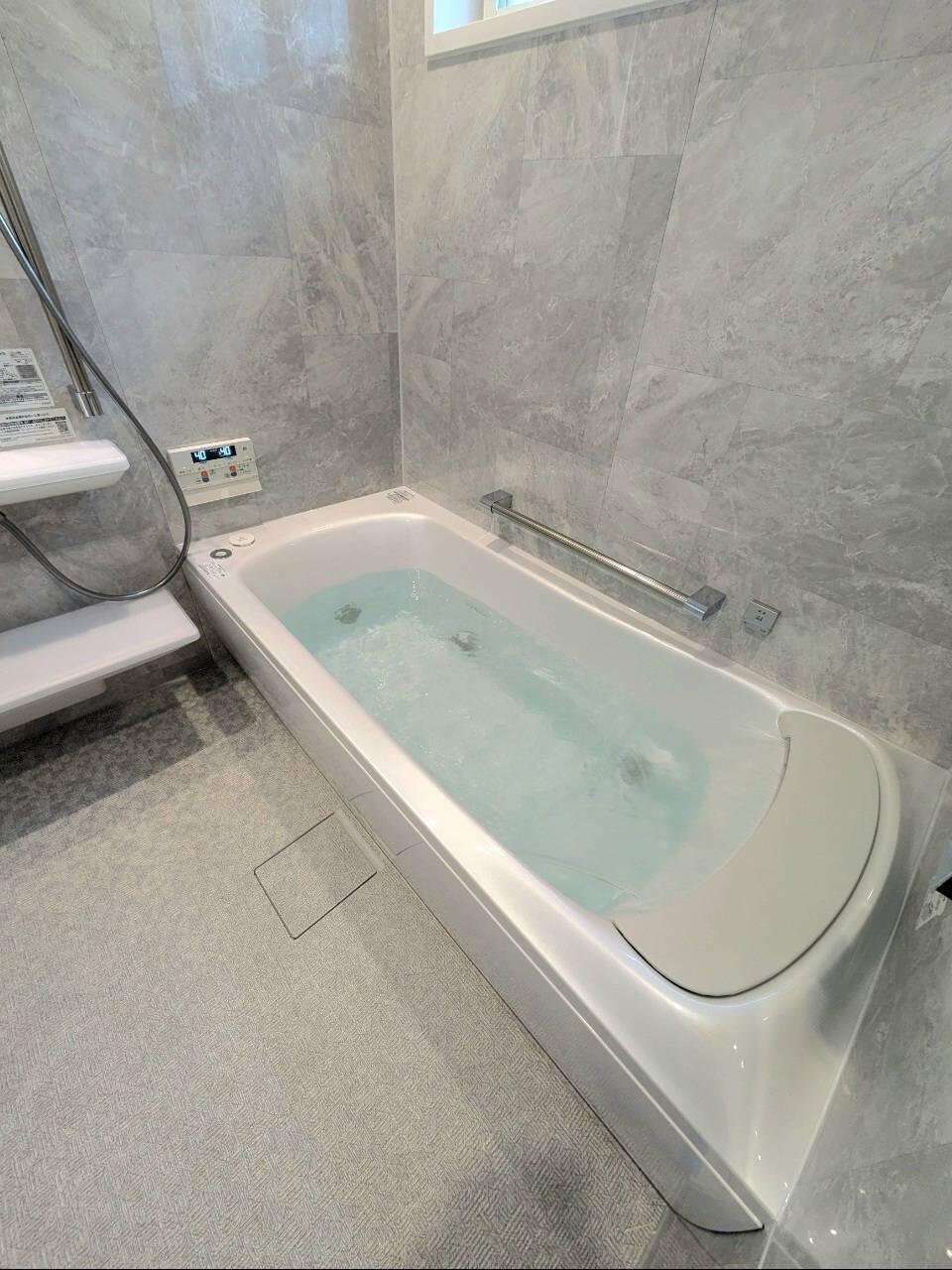 腰と肩を一度にたっぷりのお湯で温める「楽湯」が人気のTOTOのシンラ(SYNLA)を設置しました。 入浴後にボタンを押すだけ!浴槽内を自動で洗う「おそうじ浴槽」や「床ワイパー洗浄(きれい除菌水)」で掃除のストレスが無くなりました♪