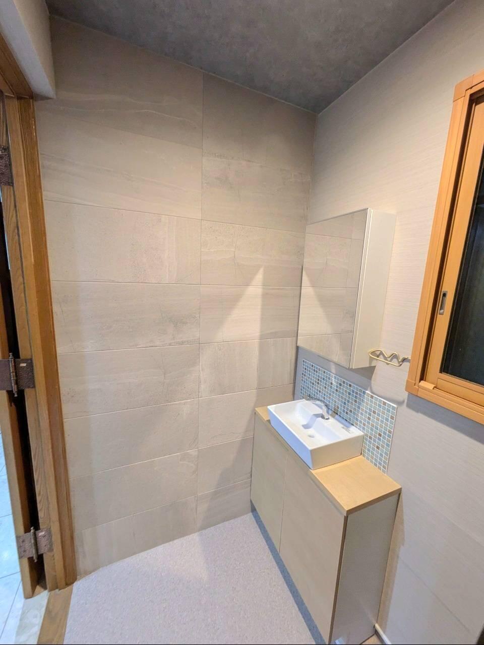 さまざまなユニットを組み合わせて思い通りの空間に! 「キャパシア」はトイレ空間に最適な工夫が詰まったセミオーダー手洗器です。 洗面器後ろに「スマートモザイクシート」を貼り、アクセントにしました。