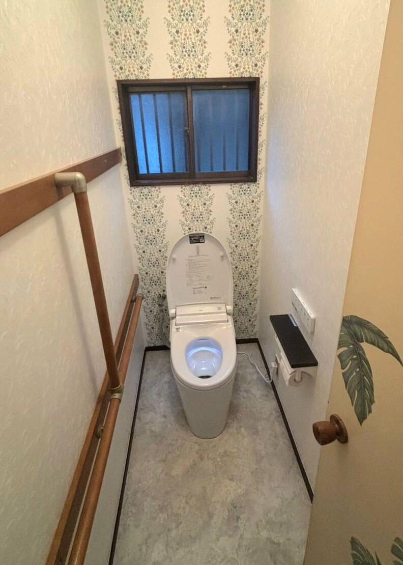 コンパクトなサイズで、トイレ空間に広がりをもたらすスタイリッシュモデル「サティスS」を設置しました。 衛生陶器の「アクアセラミック」は汚れがつきにくく、落ちやすいので、お掃除がラクです。 床と壁紙も貼り替え、明るい雰囲気のトイレになりました。