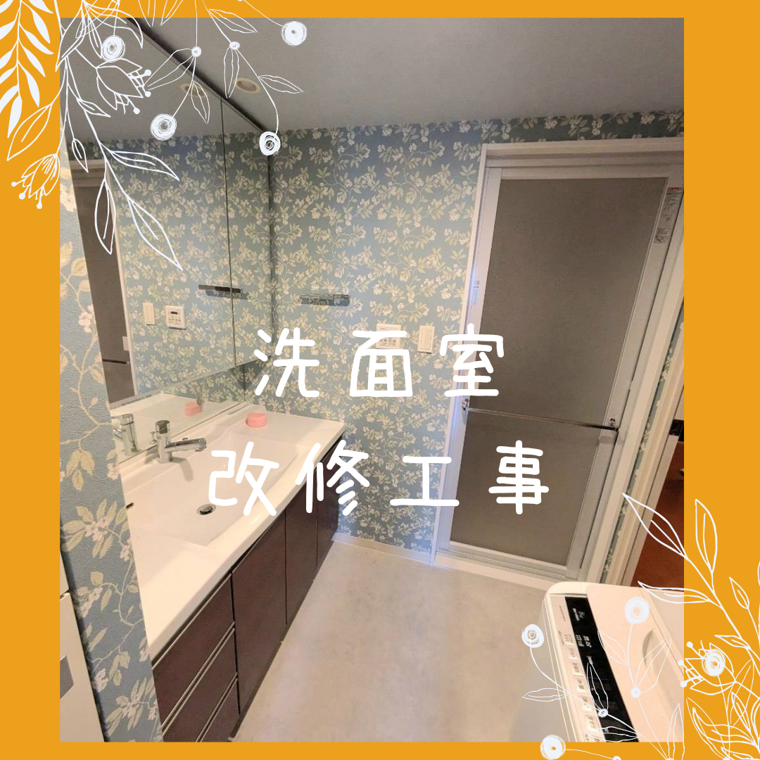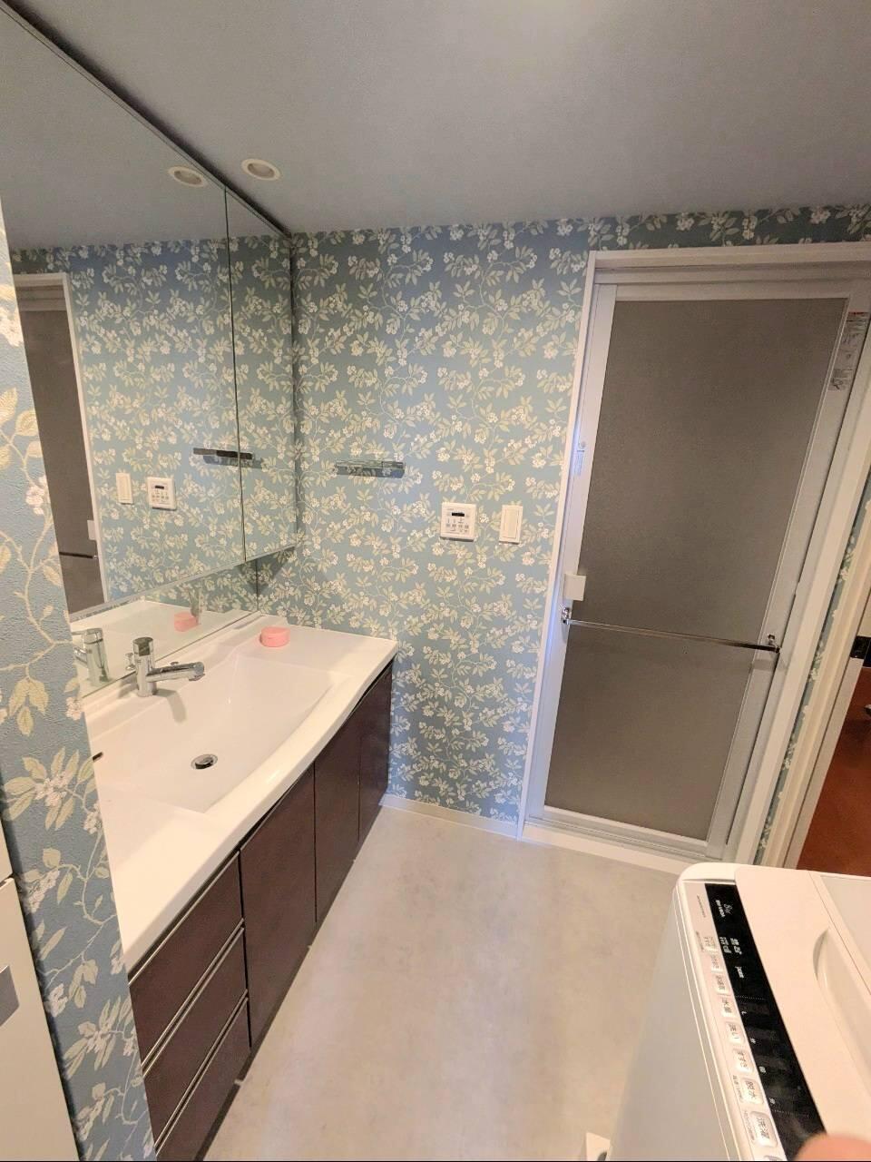 洗面室のリフレッシュ工事をしました。 壁紙を新しくして心機一転! ニュアンスカラーのシックなブルーに白い花柄とストライプの壁紙で、爽やかなのに落ち着いたリラックス空間に仕上がりました♪