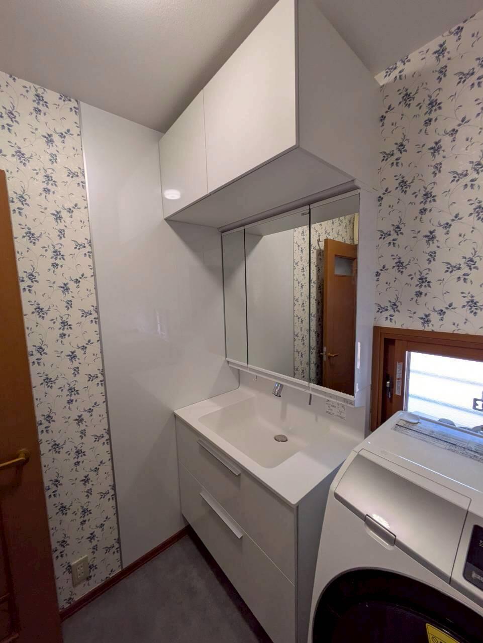洗面化粧台の交換をしました。 LIXILのクレヴィは収納も多いだけでなく、上から吐水することでお手入れがしやすい「キレイアップ水栓」や、はねた水滴をサッと拭き取りやすい「キレイアップカウンター」などの機能と、合理的でユニークなデザインも魅力です。 壁紙も一新して、明るい洗面室になりました♪