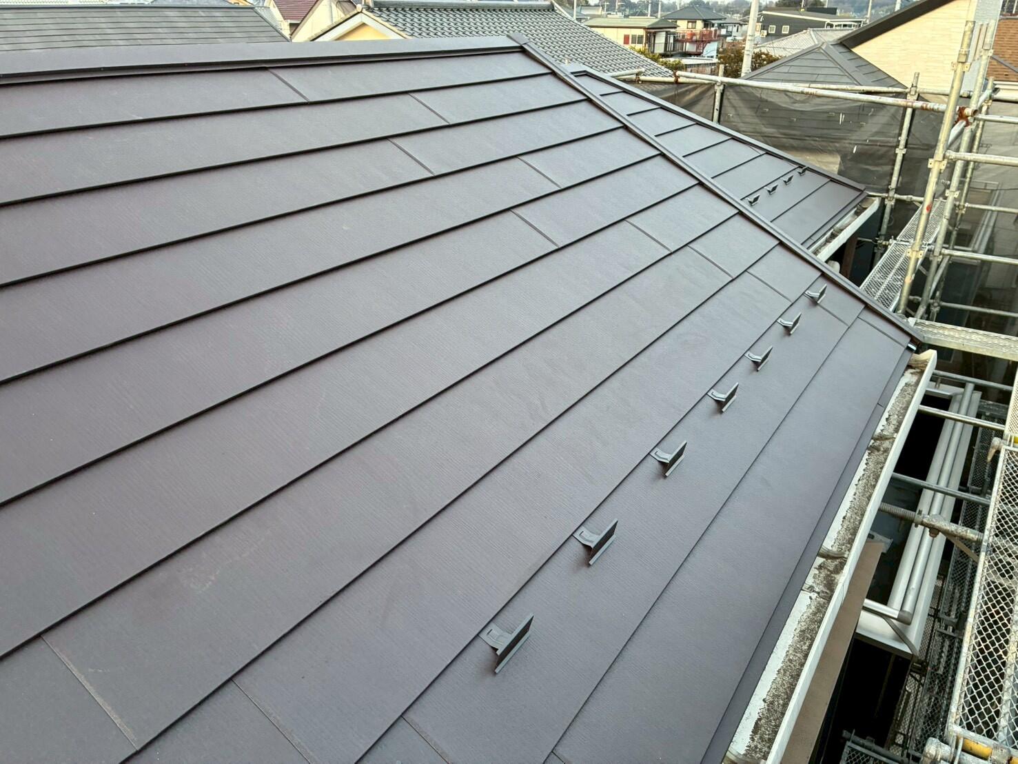 経年劣化が気になってきた屋根をカバー工法でリフレッシュしました。 屋根材はスーパーガルテクト、色はシェイドブラウンです。 「カバー工法」は既存の屋根を剥がさず、そのまま上から新しい屋根材を重ねるので、工期も短く、既存の屋根の解体や処分する手間がかからないのでコストを安くすることができます。 屋根材と色を合わせた雪止めを設置、外観を損なわない仕上がりになっています。