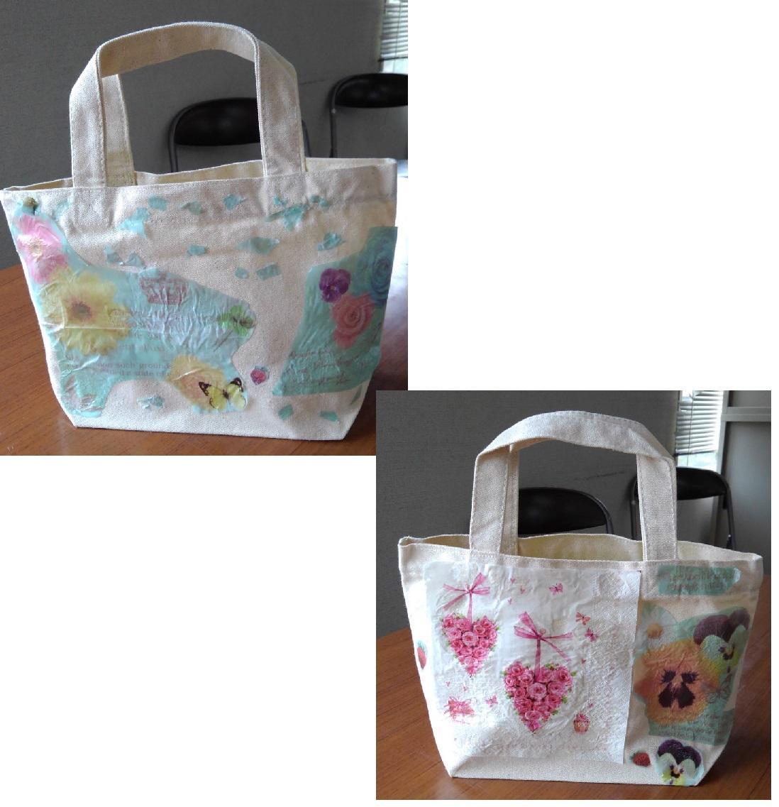 ペーパーナプキンを専用の接着剤で布やスマホケースに移し貼る「デコパージュ」。今回はキャンバス生地の手提げにデコパージュしてもらいました☆