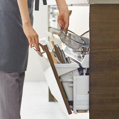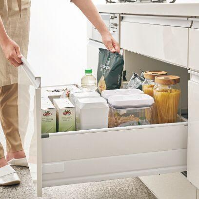 キッチン下が引き出しになっていると、開き戸では出し入れしにくかった奥までしっかり収納することができます。
