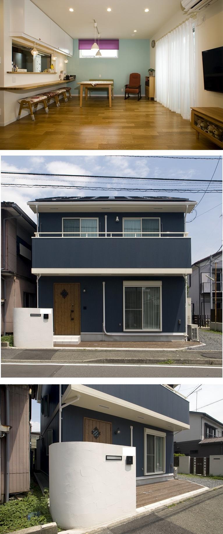 外観は紺のサイディングと木目の玄関ドアが目を引きます。それとは対照的に真っ白な門塀が芸術的で素敵ですね。