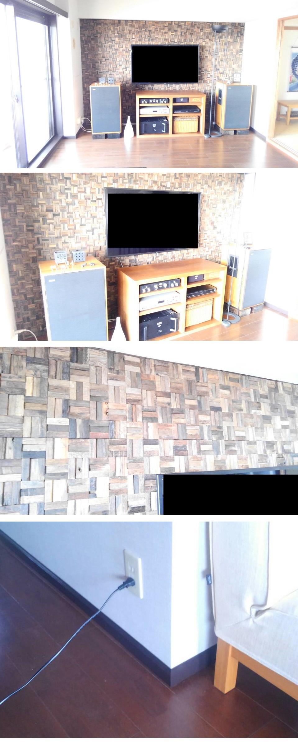 オシャレな木材ユニットをテレビ裏の壁に貼り、とっても味のある大人っぽい素敵な空間に!