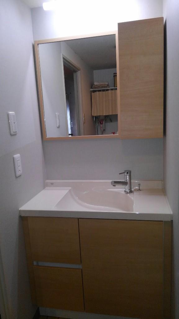 木目が素敵な洗面化粧台へリフォームいたしました。収納も便利になりすっきりしました。(LIXIL エスタ)