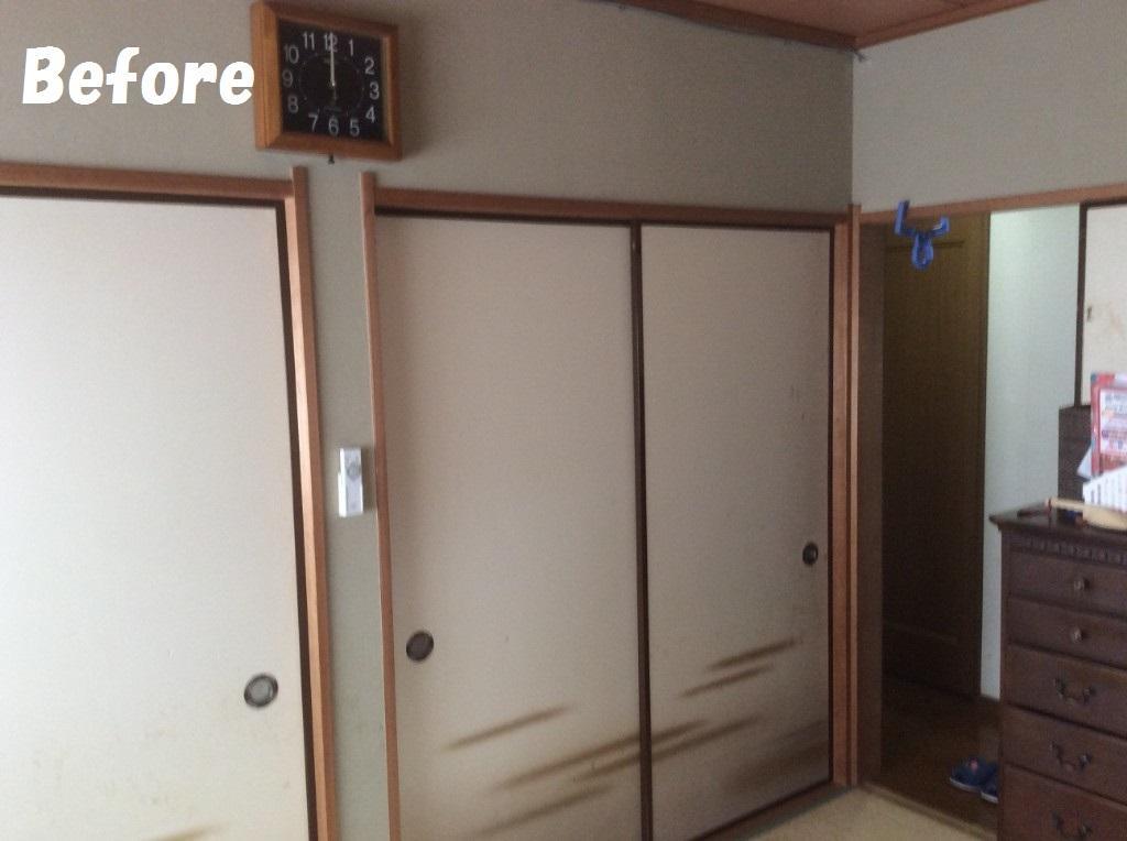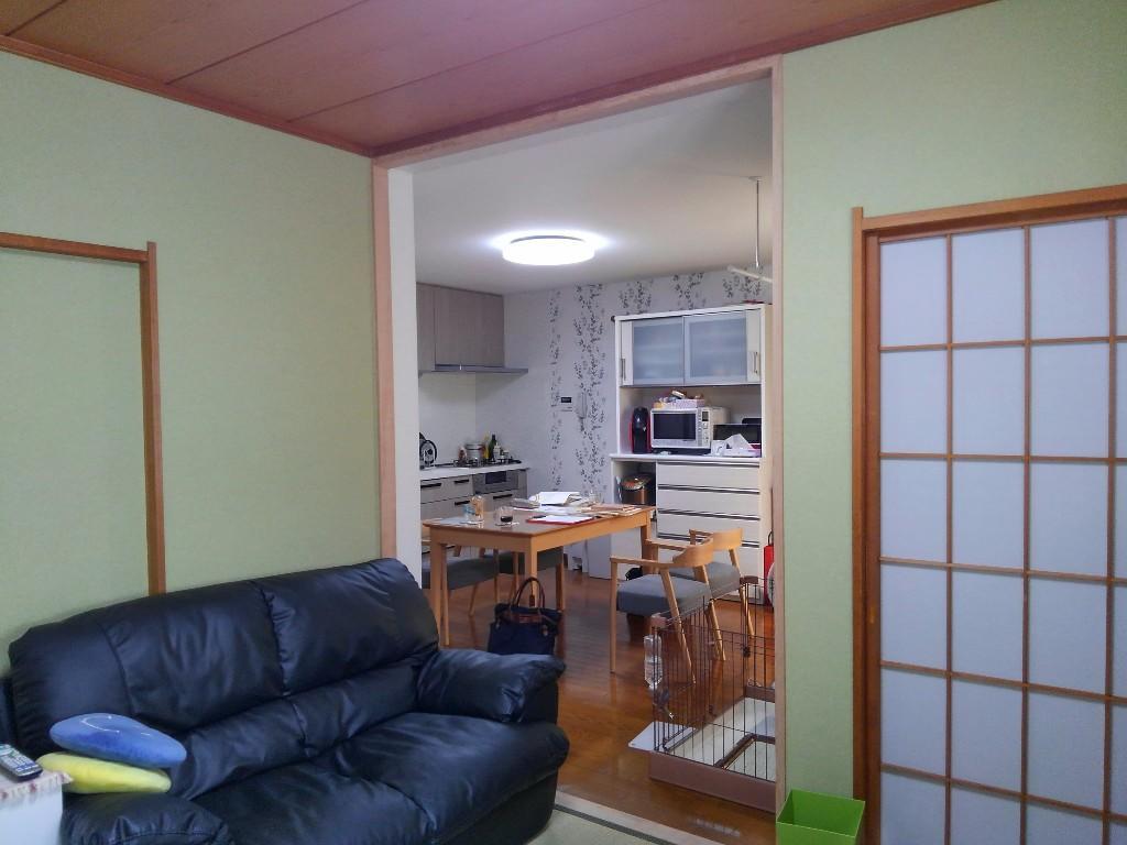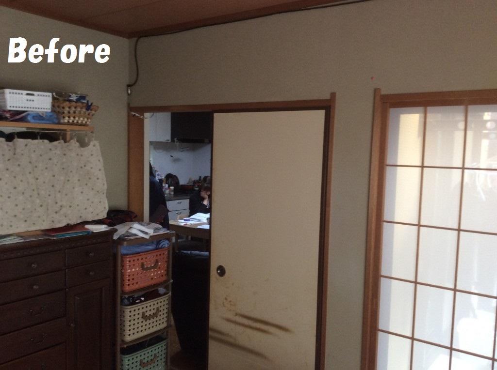 ■施工前■キッチンと和室の間に襖がありチェストなども置いてあったため通りにくく、壁まで撤去して広々としたひと続きの空間へリフォームご希望。