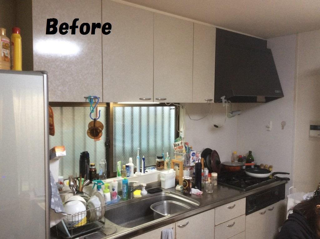 ■キッチン施工前■明るいカラーのキッチンですが、換気扇フードは黒く、シンクやワークスペースはステンレスでした。