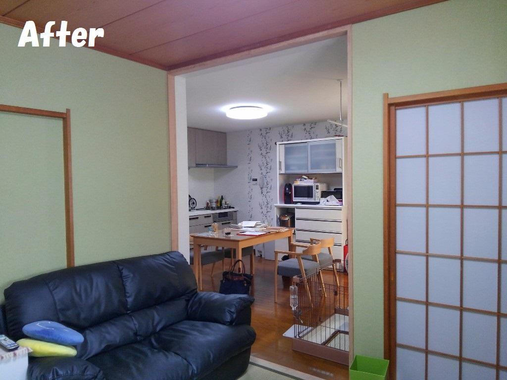 ■施工後■天井まで仕切りを撤去し、広く明るいひと続きの空間となり、和室とダイニングキッチンの行き来がスムーズになりました。