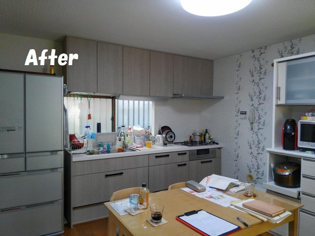 ■キッチン施工後■LIXILのキッチン「リシェル」をお選びいただきました。木目調の明るいカラーで落ち着きがあり、換気扇の上の部分も同じカラーで統一。換気扇は10年間ほとんど汚れないという「よごれんフード」。ワークスペースには人造大理石の明るい色をお選びいただき、今まで以上に明るいキッチンへ変身しました。また収納も今までの約1.5倍に!壁紙もお好みのステキな柄へとチェンジ。キッチン全体がより一層明るい印象になりました。