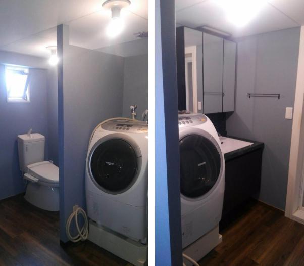 ・洗面化粧室の中に、パーテーションで切られたトイレブースがあり、圧迫感を感じていました。パーテーションは思い切って取り払い、トイレ前方面に造作壁を造り、空間をゆるやかに仕切りました。