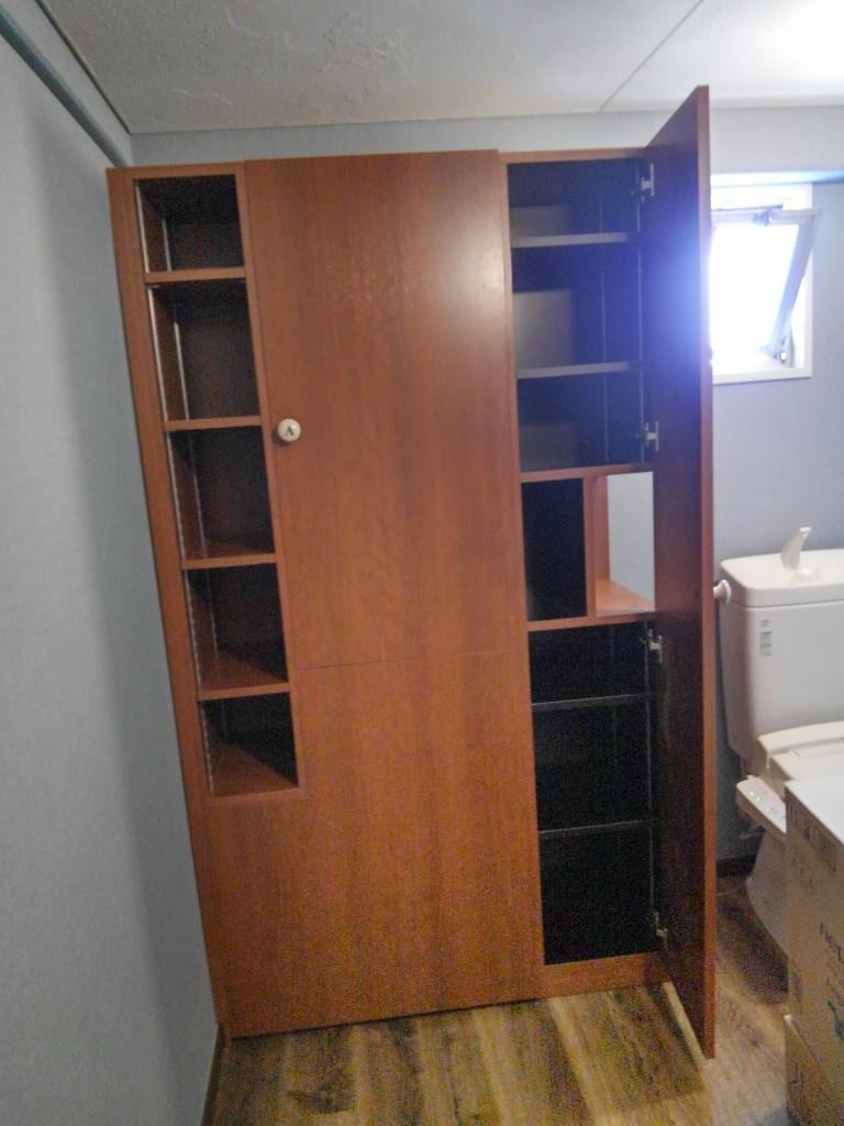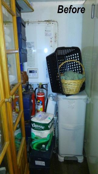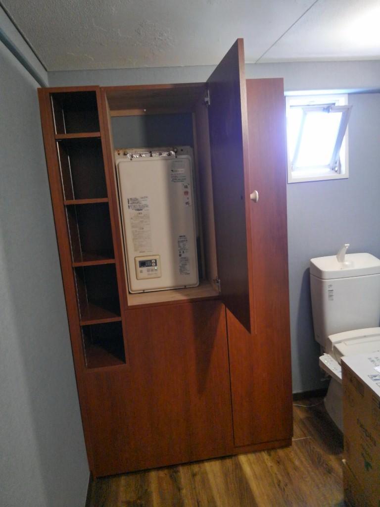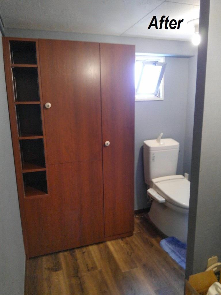 ・また洗面化粧室内に剥き出しで設置された給湯器を隠し、雑然と置かれていた小物を納められる造作収納を設置。部屋全体がとてもすっきりとなりました。