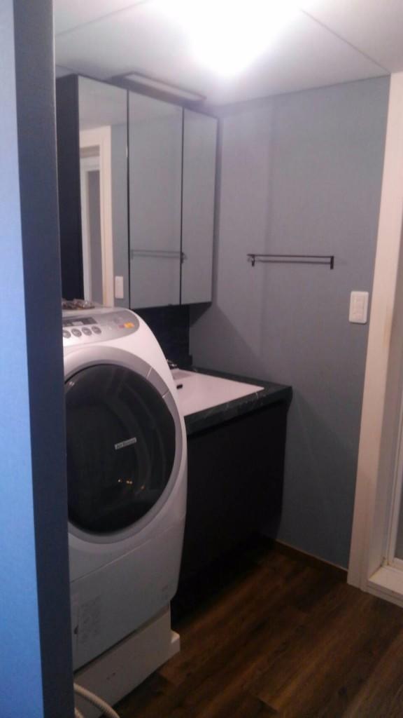 ・古くなった洗面化粧台は交換し(ルミシス)、内装もお好みの雰囲気に一新。落ち着いたブルーの壁クロスとシックなルミシス、また造作家具のブラウンがマッチし、お部屋全体がお洒落な空間になりました。