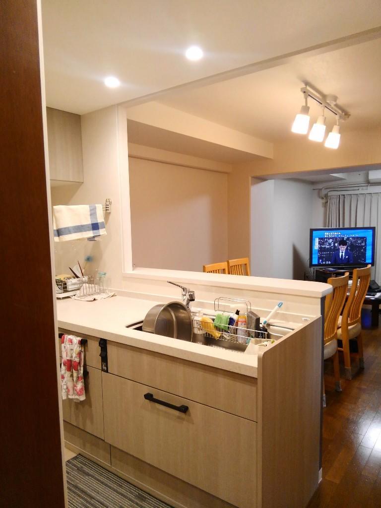 ☆キッチンは、ダイニング側の吊り戸/壁を取り払い、オープンに。ご家族が集うダイニングキッチンが開放的になり、すぐ奥のリビングもぐっと近くなりました。