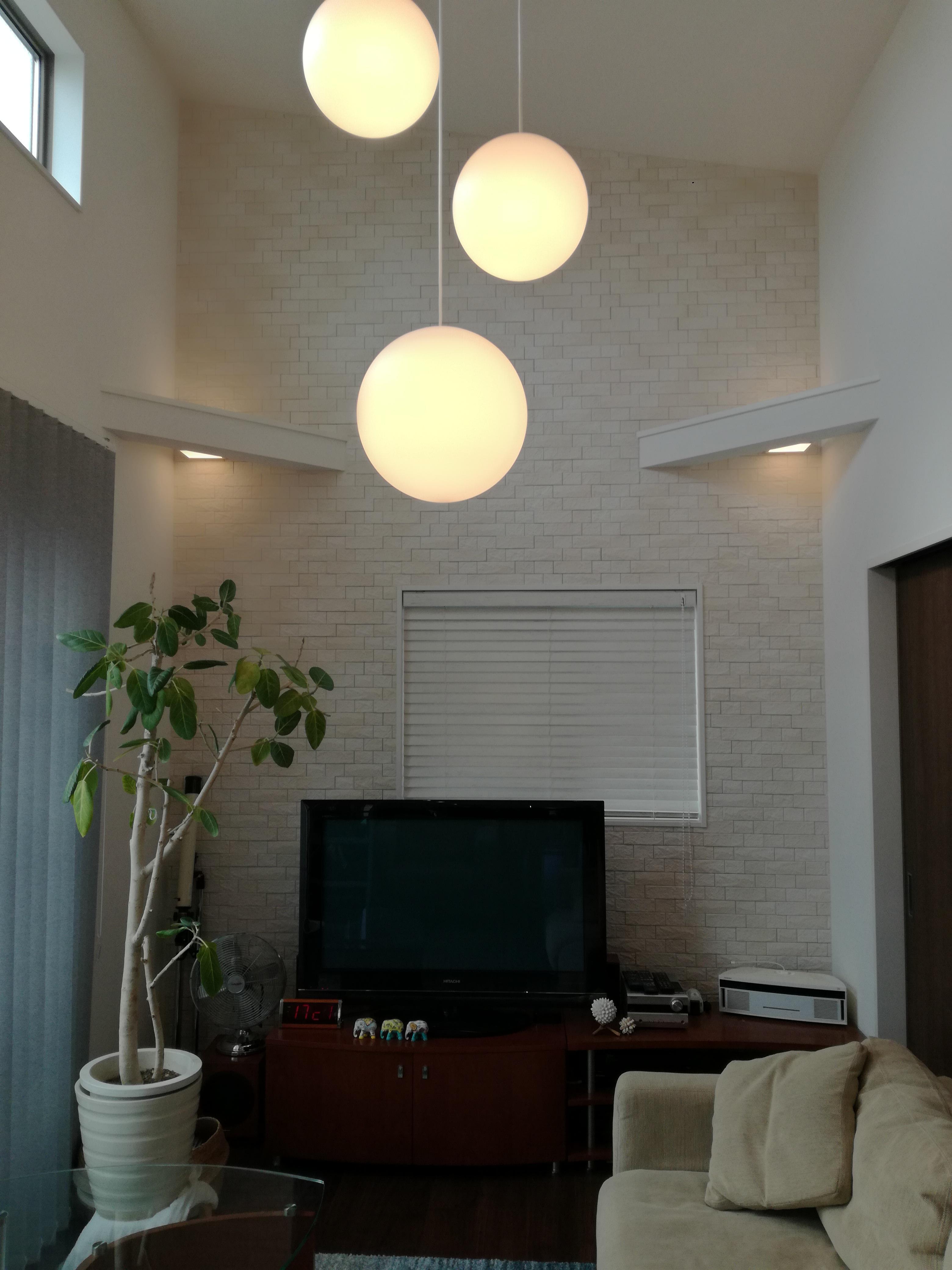 ☆リビングは1階から吹抜けの上部まで貼った白系レンガ調の壁と吊り下げ照明が空間の一体感を生んでます。