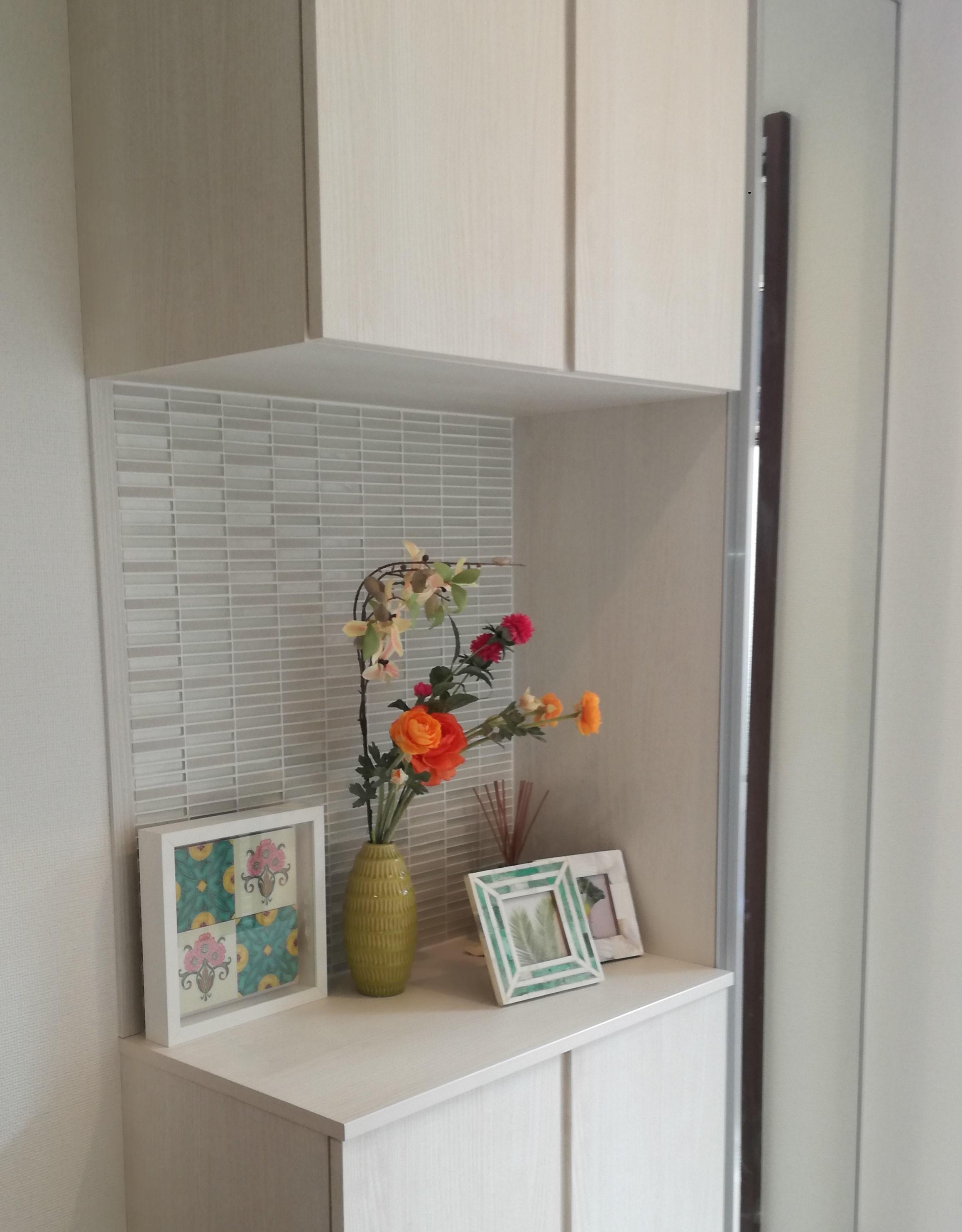 ☆玄関の壁にタイルを貼ってアクセントの効いたお出迎え。