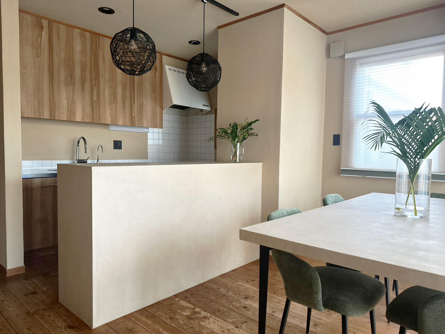 水まわりの安心感と、LDK・洋室のデザイン性をどちらも高めるリフォームとなりました。特にカウンターデスクのモールテックス仕上げは、お客様のこだわりを反映したオンリーワンの空間に。既存を活かしながら洗練された雰囲気に仕上がり、ご満足いただけました。