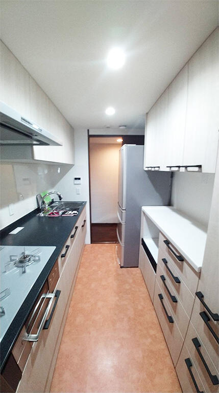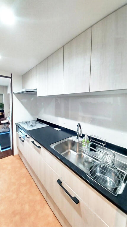 キッチンの棚や床、洗面台やトイレの床など、それぞれの空間で色のバランスやデザインを丁寧に検討。