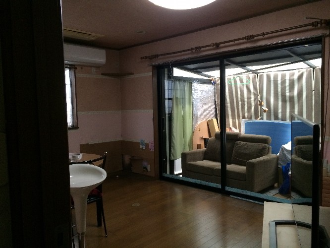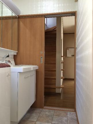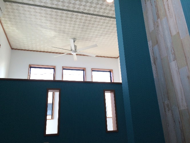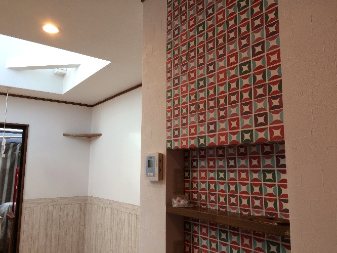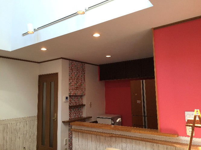 築約30年の一戸建住宅のリフォームです。リビングに吹抜けをつくり明るく開放感のある部屋に生まれ変わりました。ビビットカラーの壁紙がとてもかわいく印象的です。