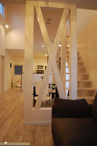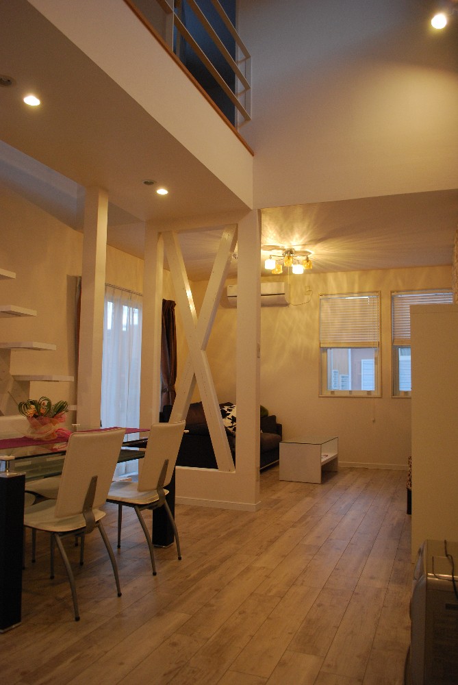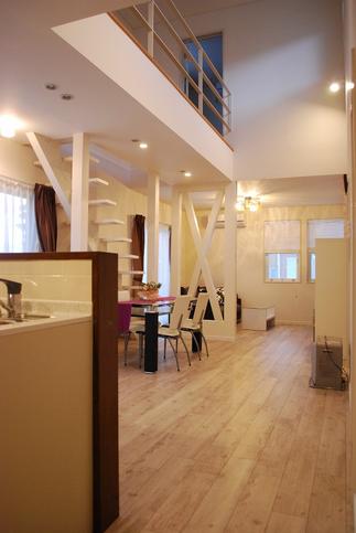 アンティーク雑貨・インテリアがお好きなご夫婦の新しい住まいのリフォームです。 構造上、重要な柱は残し耐力壁の筋交いをあらわにした。温もりを感じさせる木製のストップ階段を設置。上下の階と吹抜け空間を融和させる事が出来ました。気分はちょっとアメリカン。