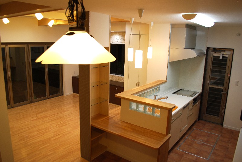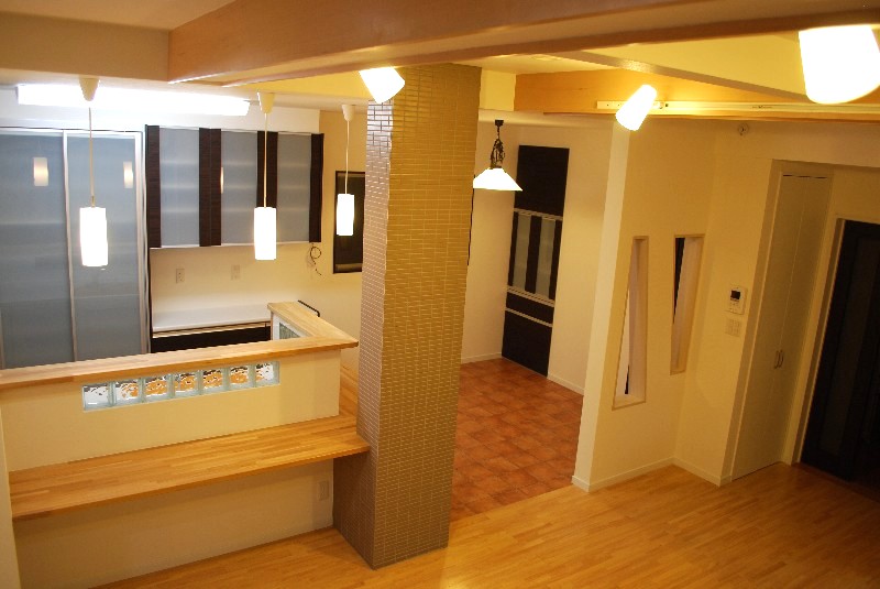 築30年の典型的な間取りで、ガス台・流し台だけが置かれた台所。冷蔵庫・家電品・食器棚の配置もバラバラで食卓テーブルを置く事が出来ません。生活動線を見直し、奥様憧れの対面キッチンにしました。リビング・キッチン・ダイニング・独立性を保ち、それぞれの収納を確保していながら、3つのスペースがつながり一体化する事が出来ました。耐震診断に依る補強工事と広々空間をデザインし奥様の希望の対面式を実現した快適空間が出来ました。