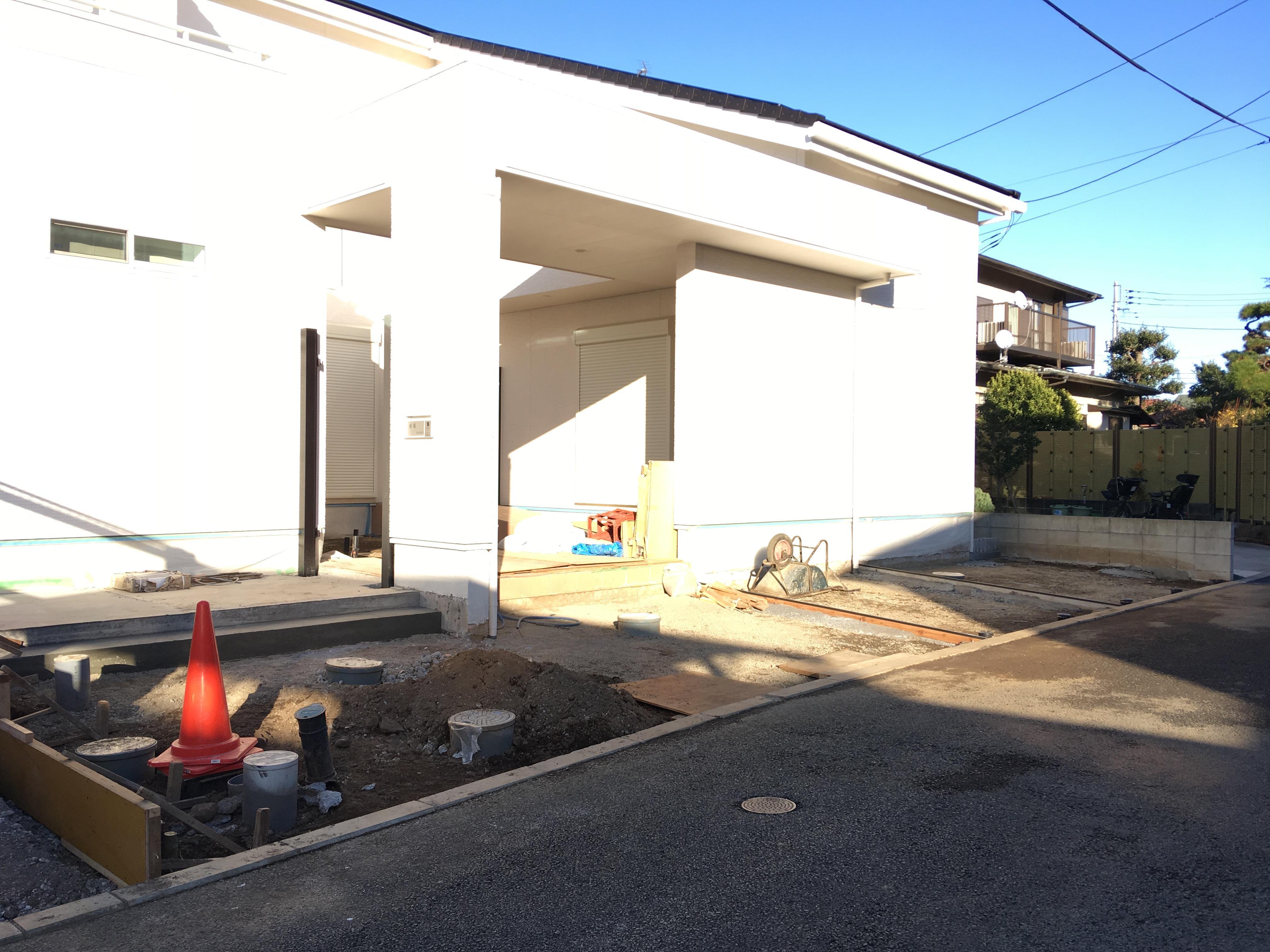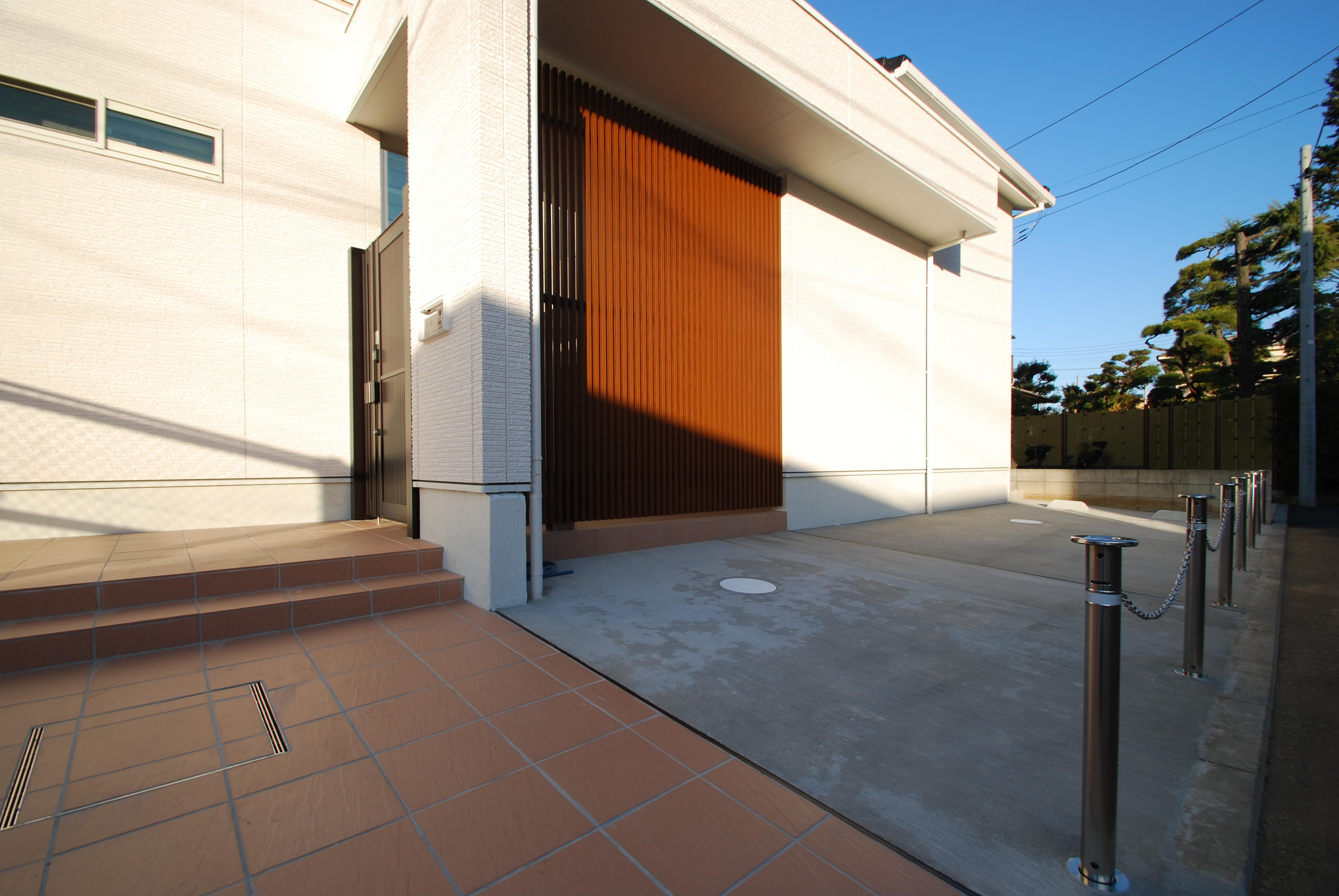 他社で新築されたお客様から、外構工事の依頼がありました。セキュリティー対策とデザインを両立させた、風通しの良いスリットフェンス。柔らかい印象となる木目にしました。階段は、なるべく段差が少ないように配慮。横にはスロープも作りました。