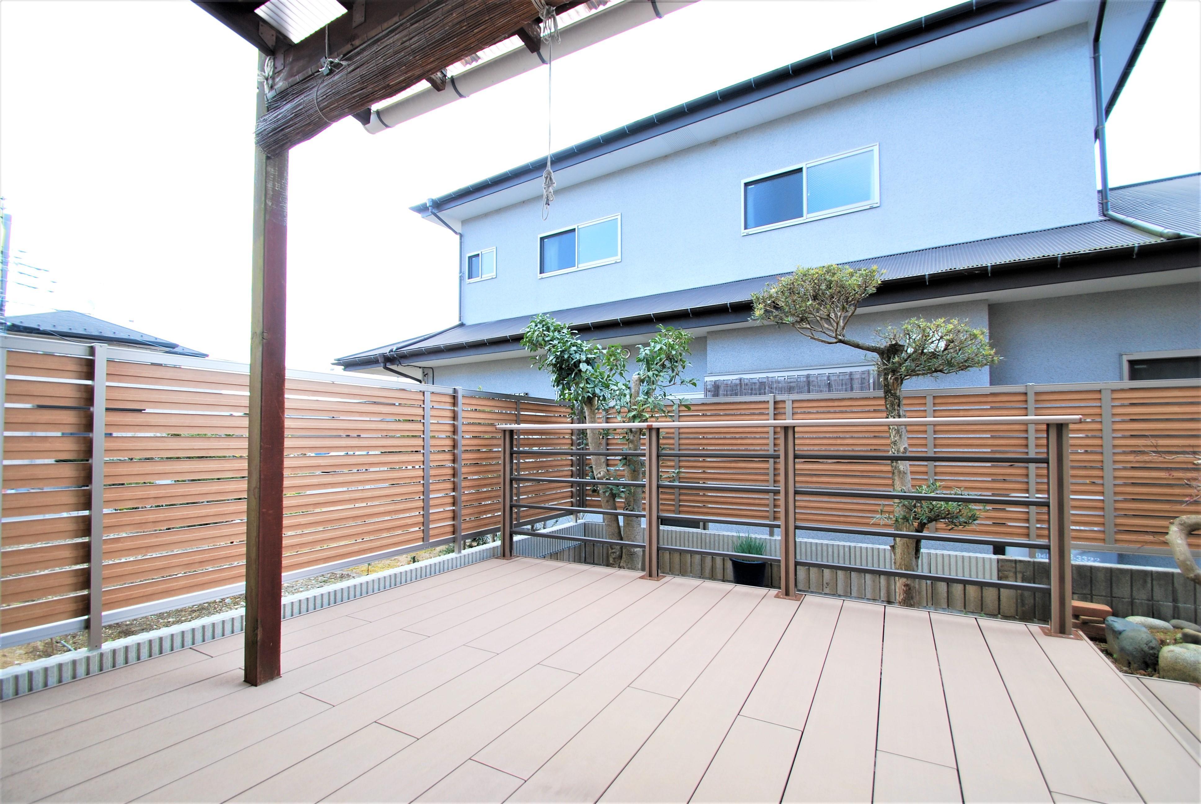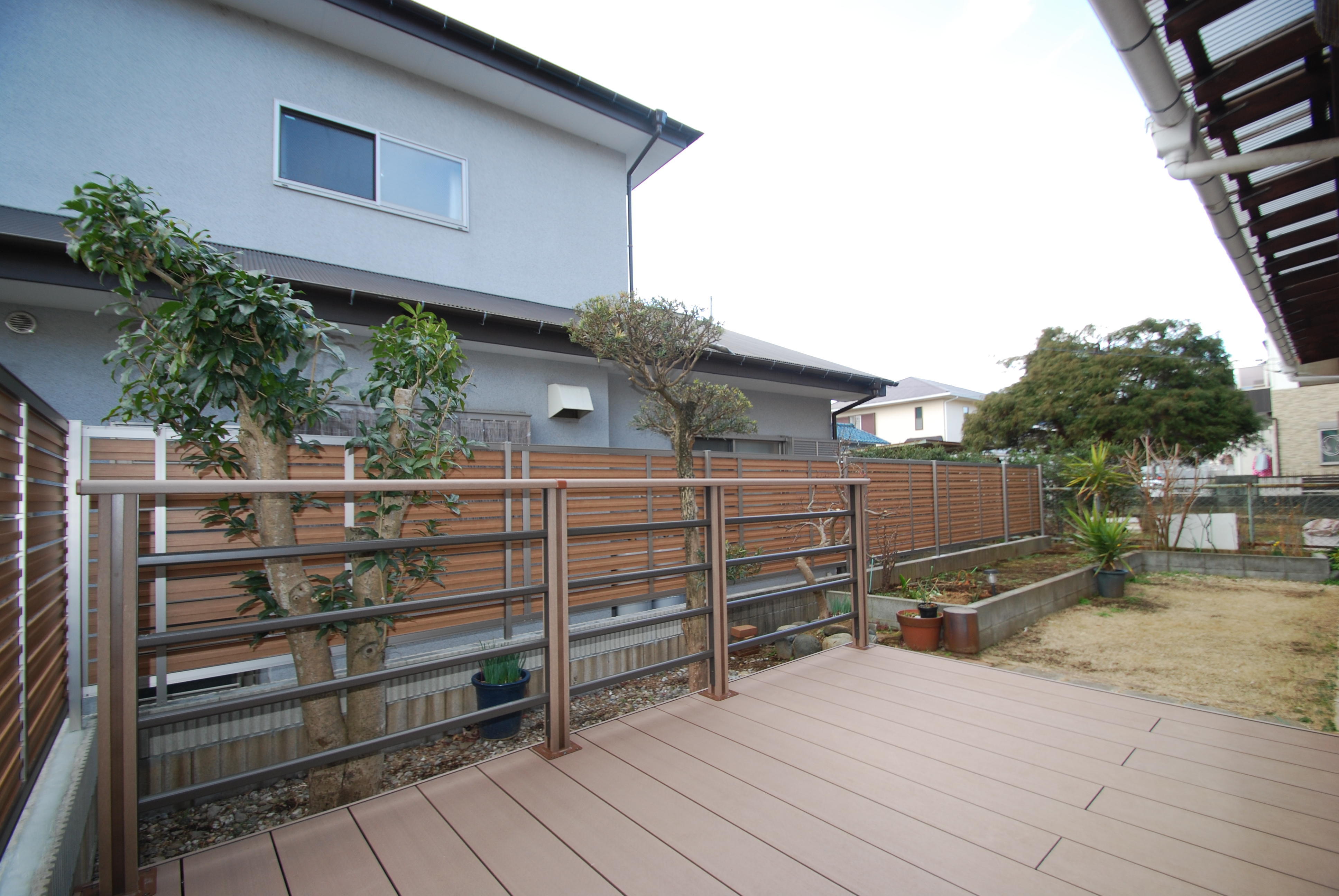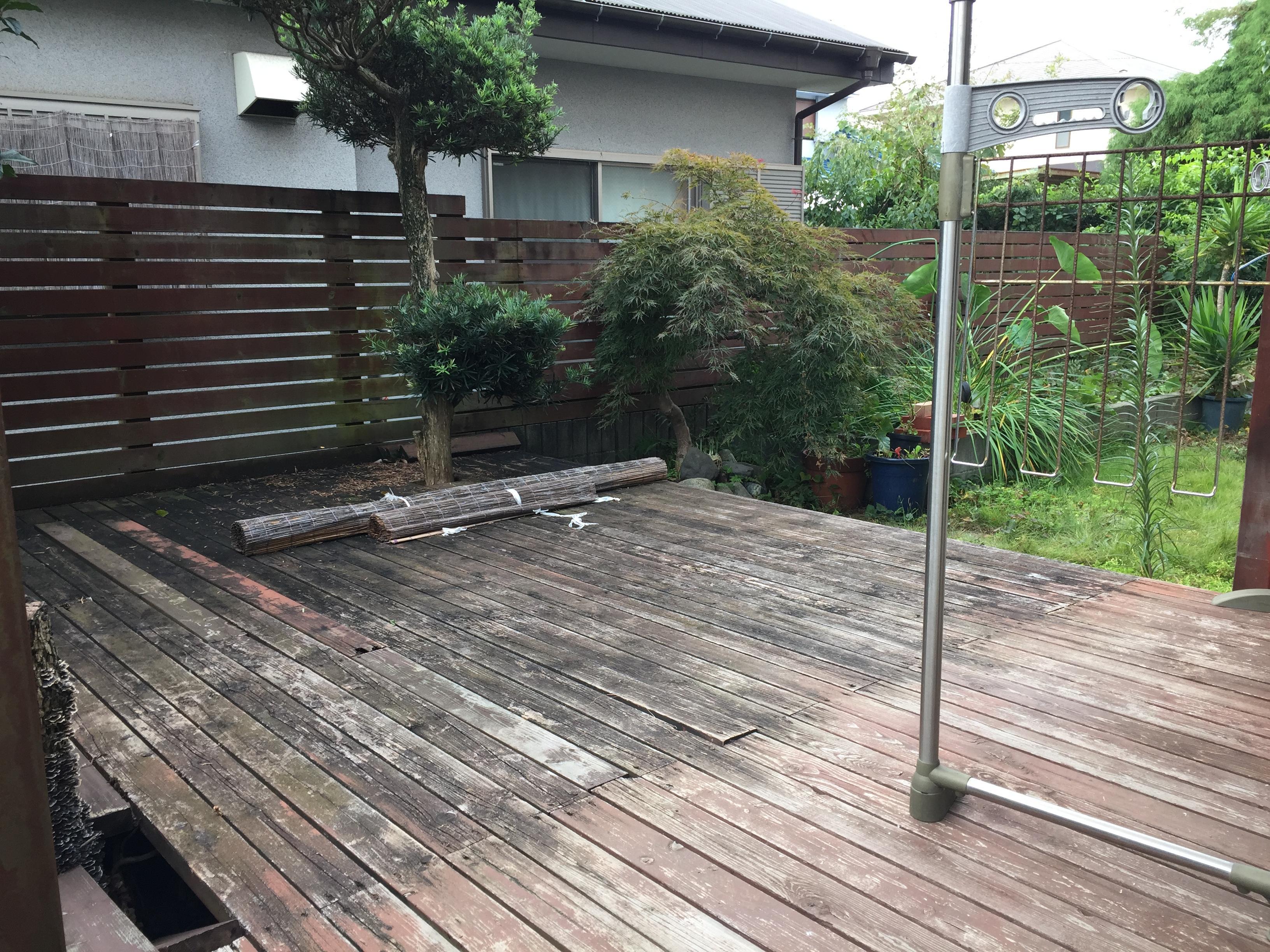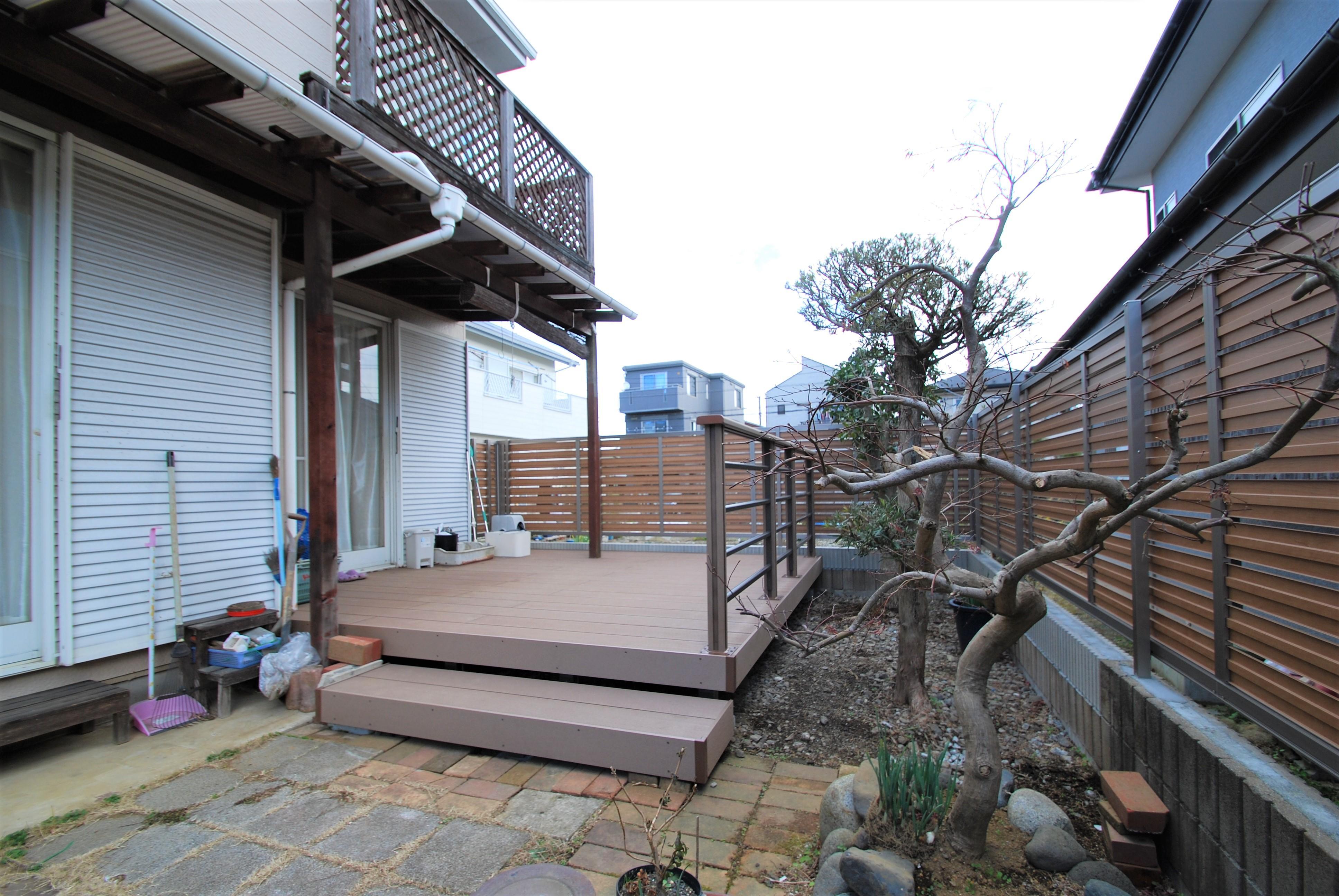 20年前に木材で作ったウッドデッキを新しく作り直しました。老朽化で床が腐り、ブカブカで踏み抜けてしまうほど痛みがありました。今度は腐らない人口木材を提案。あえて、デッキの広さを小さくし、植木の周りを整理したら、素敵ガーデンに大変身!