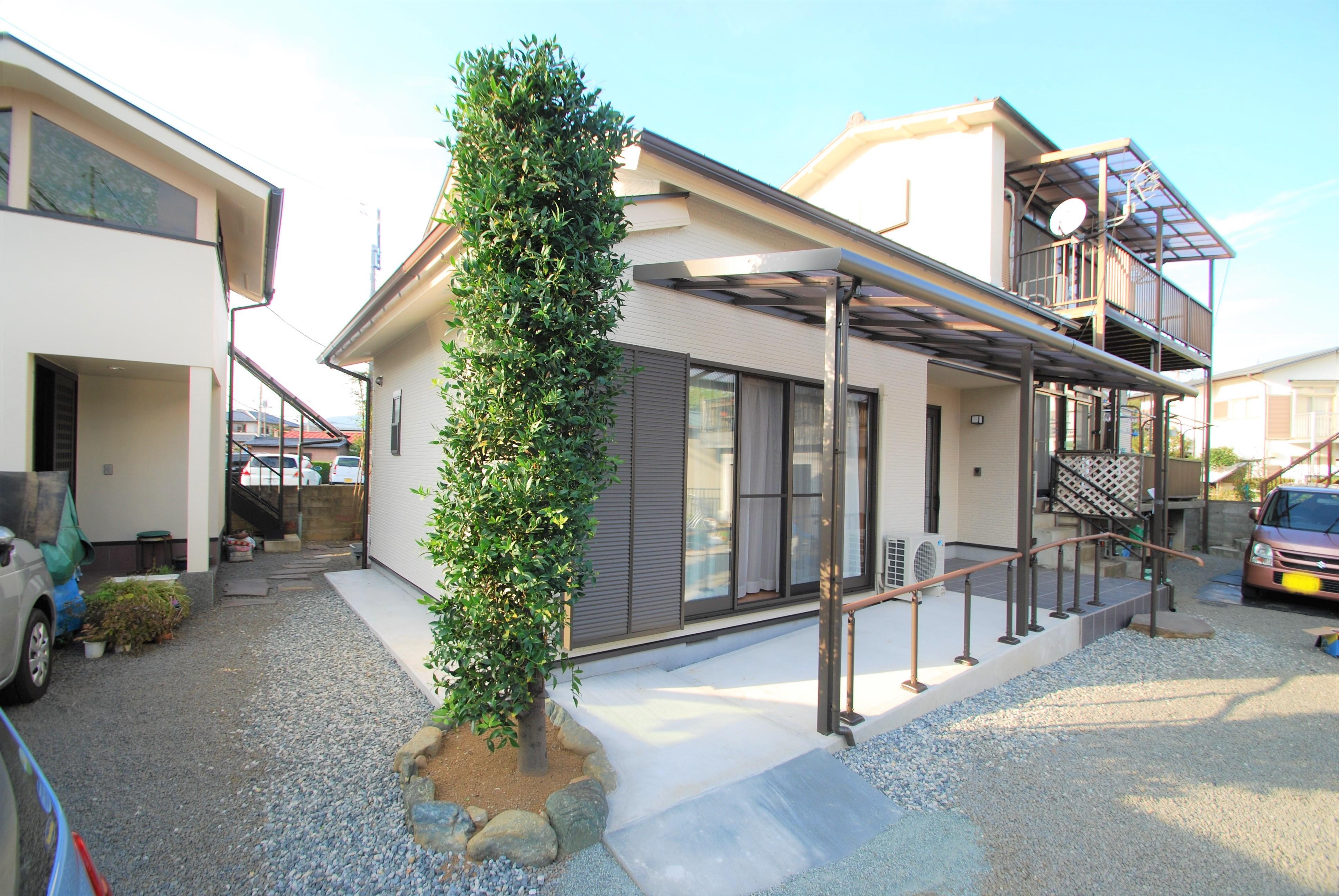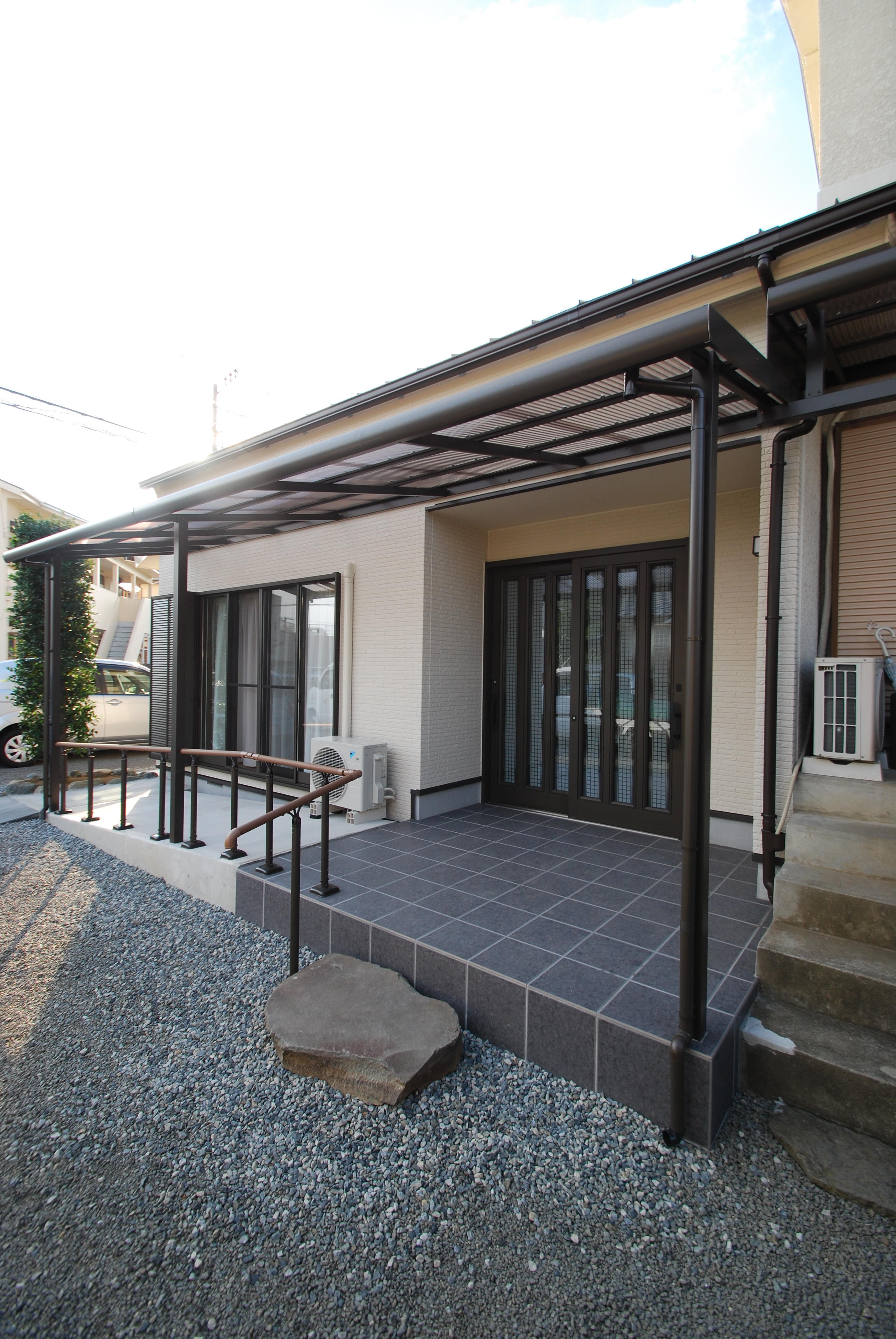 玄関までのアプローチにスロープを付けて、外出が便利に…。玄関ホールも広く取り、扉はすべて引き戸に変えています。併せて耐震補強も行いました。