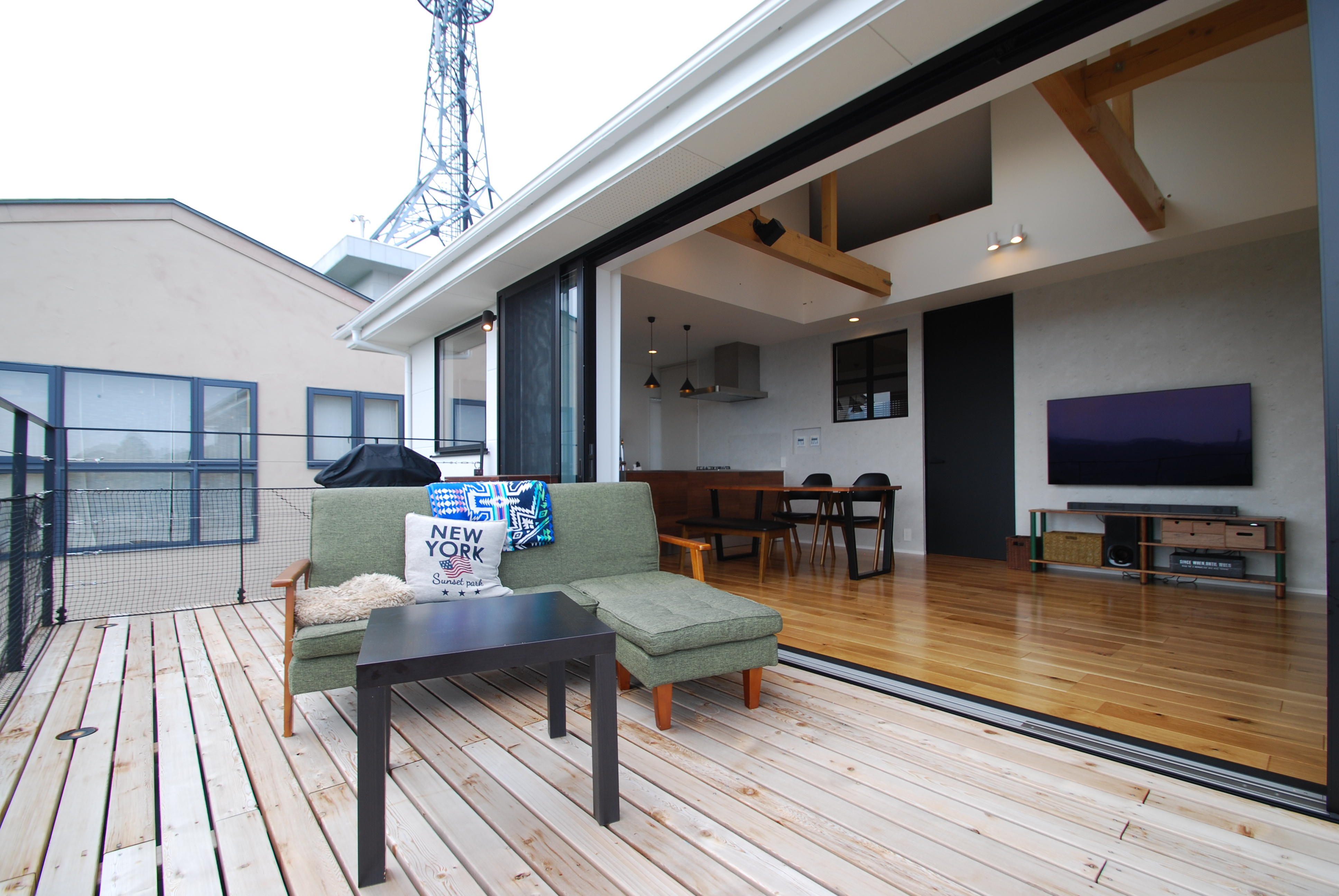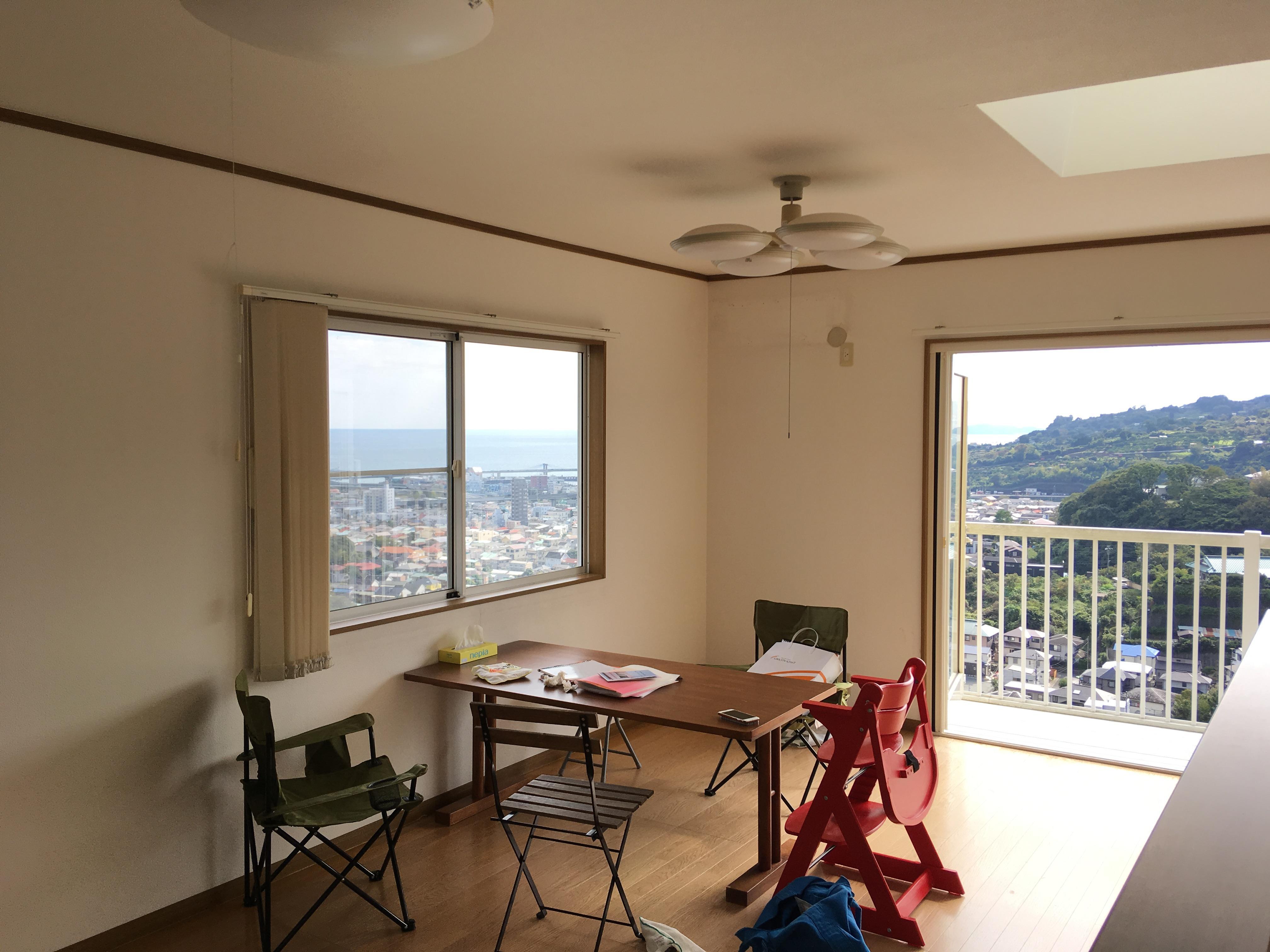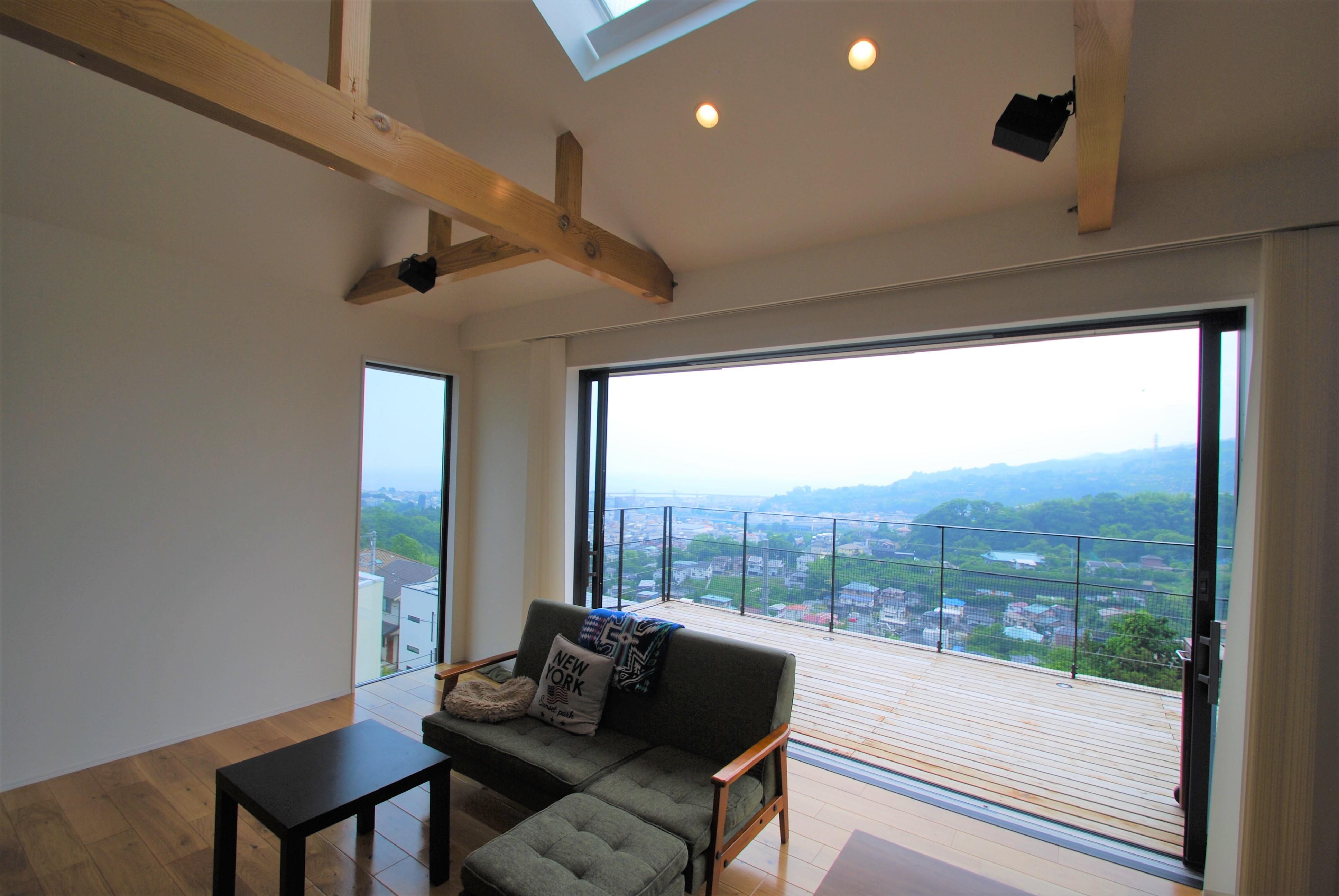 高台に建つ一軒家をフルリノベーションしました。リビングの全開口の窓とバルコニーで、眺めも開放感も最高です。 フルスライド窓を開ければ、午前と午後でことなる海風と山風を両方感じるLDKを実現。海まで見える景色を独りじめできる空間ができました。