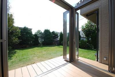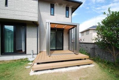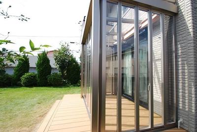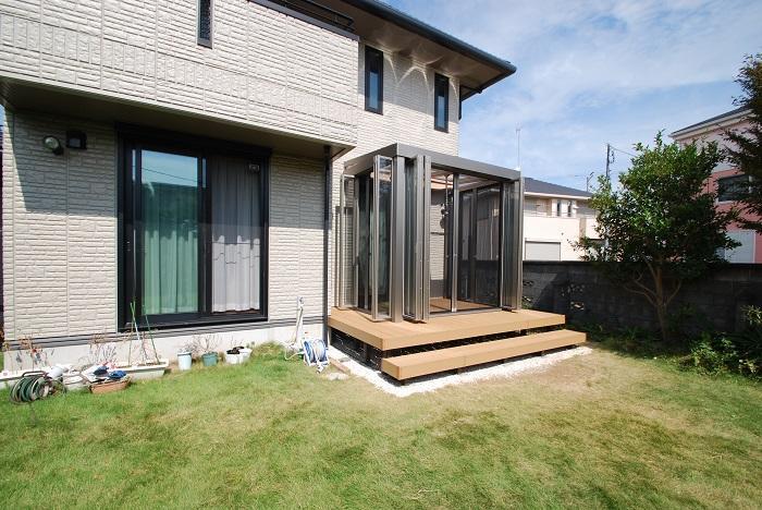 木製のウッドデッキがガーデンルームに大変身! 古くなったウッドデッキから腐らない人工木のデッキに交換。 網戸を付ければ干した洋服に虫がつく心配がありません。 内部日よけで、強い日差しもコントロールできます。 天気・季節に関係なく使えるガーデンルームが完成しました。