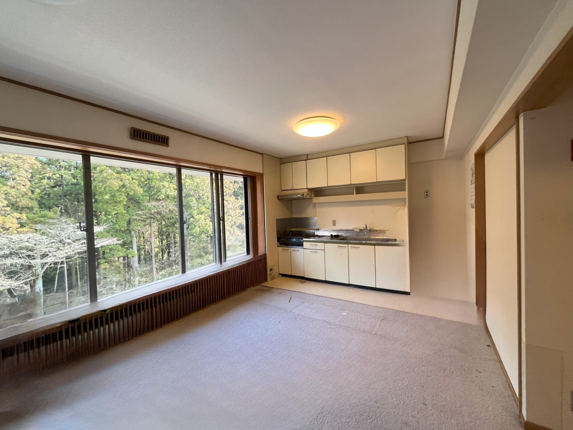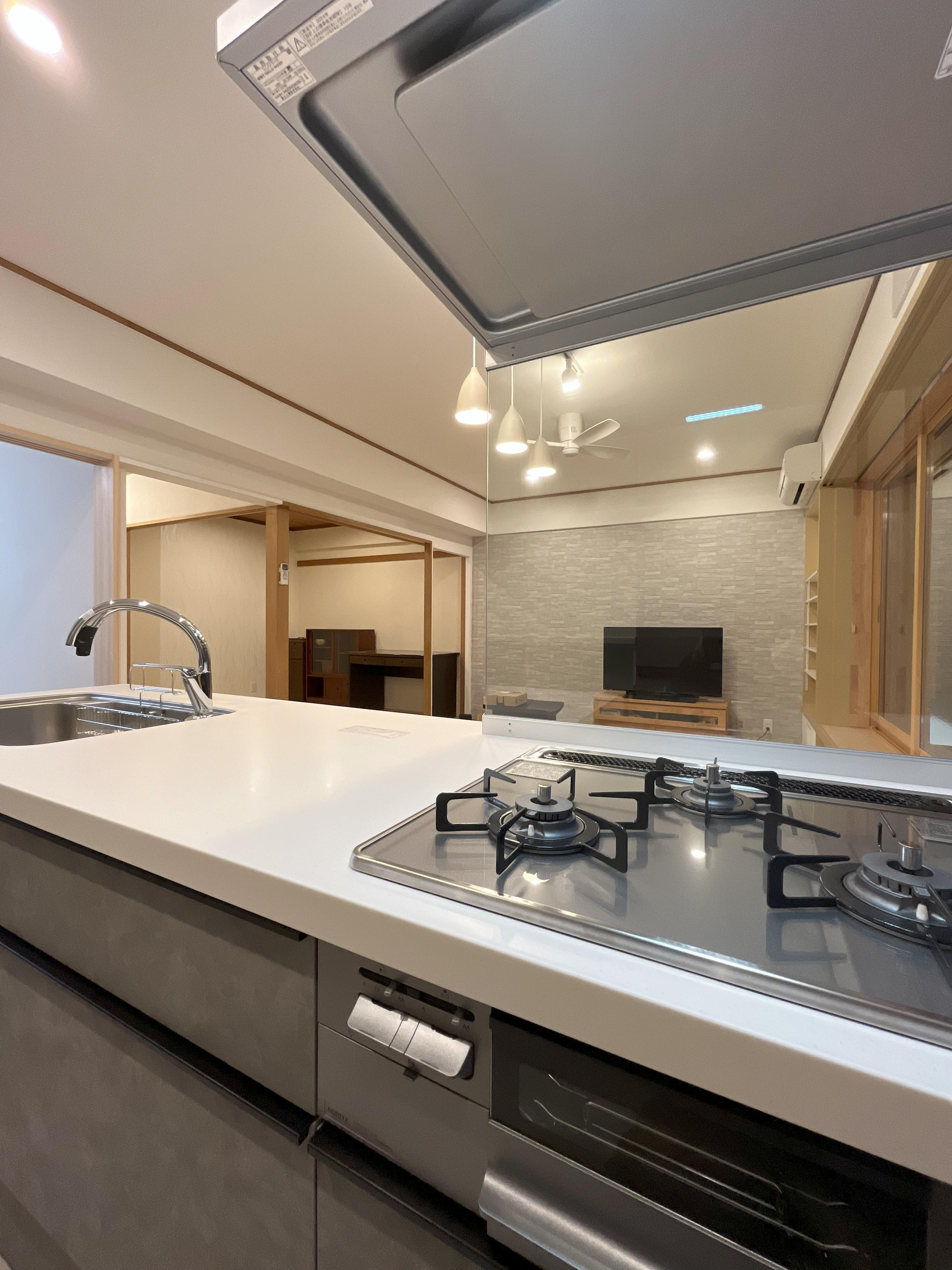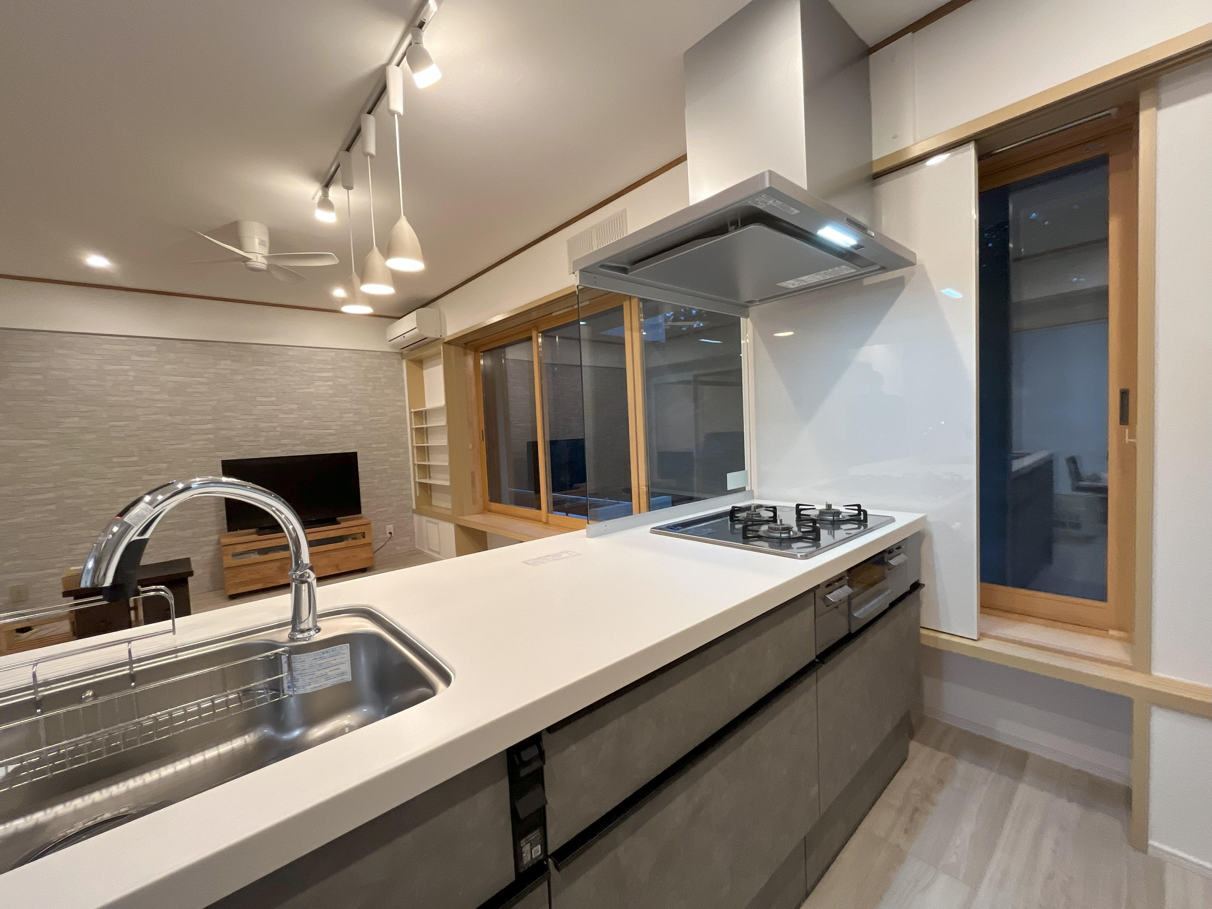 年季の入ったキッチンから、今人気の対面スタイルに変更しました。 開放感があり、家族と目が合い会話が弾むので、お料理も楽しくなります。 眺めの良い大きなまでですが、騒音と寒さがネックでした。そこで、インプラス(内窓)を付けて断熱・遮音性を向上させています。 玄関収納とクローゼットを追加して、魅せる収納の完成です。
