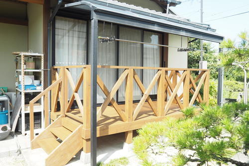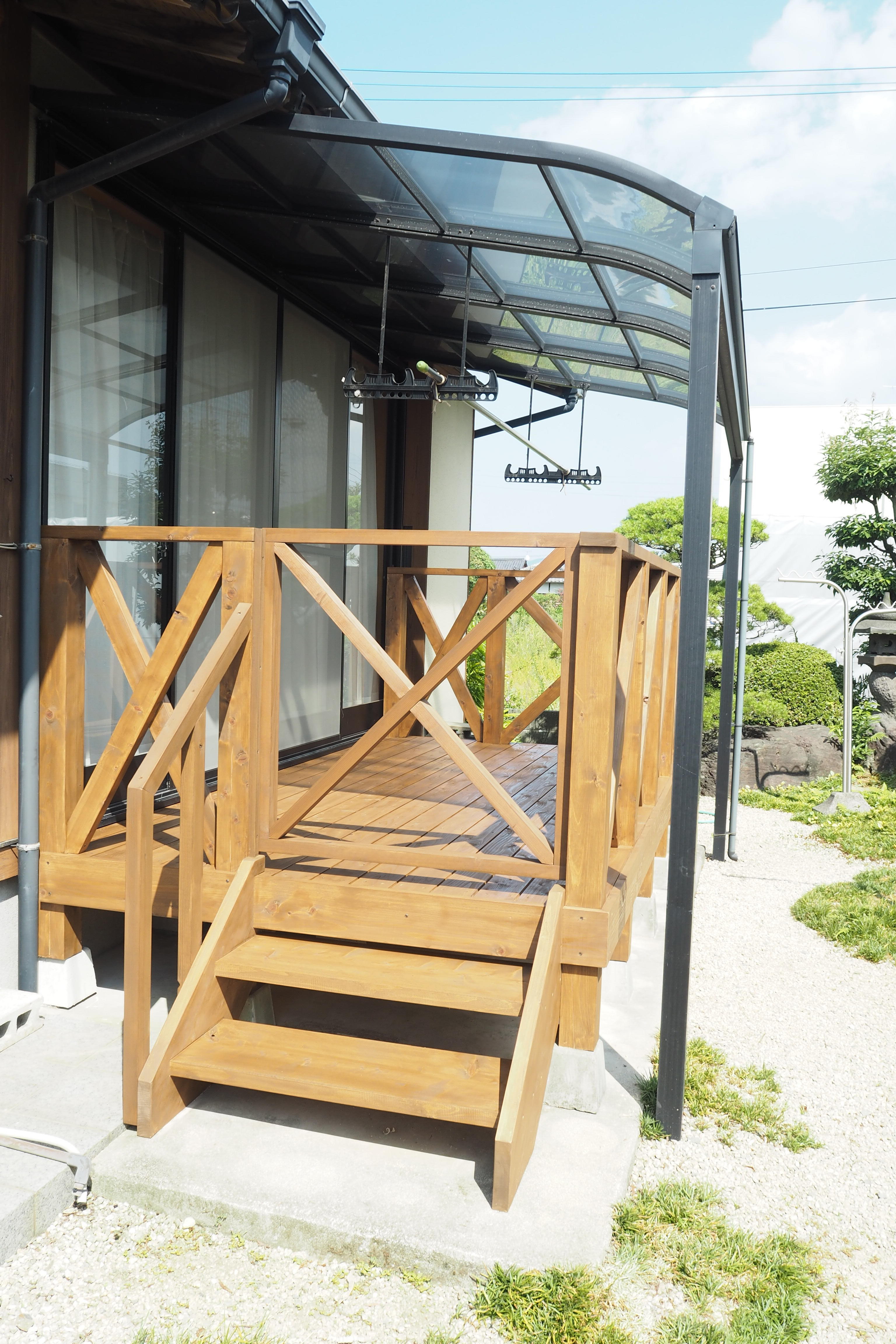 OBのお客様よりウッドデッキ工事のご依頼を頂きました。既存のデッキと同じデザインでとのご要望で作り替えました。色合いを明るくすることで、青空に映えるウッドデッキへと生まれ変わりました。素敵なお庭を眺めながら、家事も進みますね。