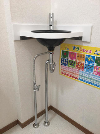 OBのお客様より連絡をいただき、別途修繕工事に加え手洗器を取り付けました。ご自宅で塾をされてある為、子供たちの手洗いにも使用します。シンプルで飽きのこないデザインの手洗器はカクダイのものです。