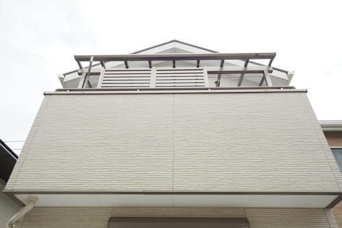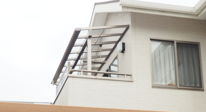 洗濯物干しスペースにテラスを設置。 紫外線対策をしながらも空を見上げられる ように透明のパネルにしました。雨の吹込 みにも対応できます。 快適になり、家事もスムーズに進みます。